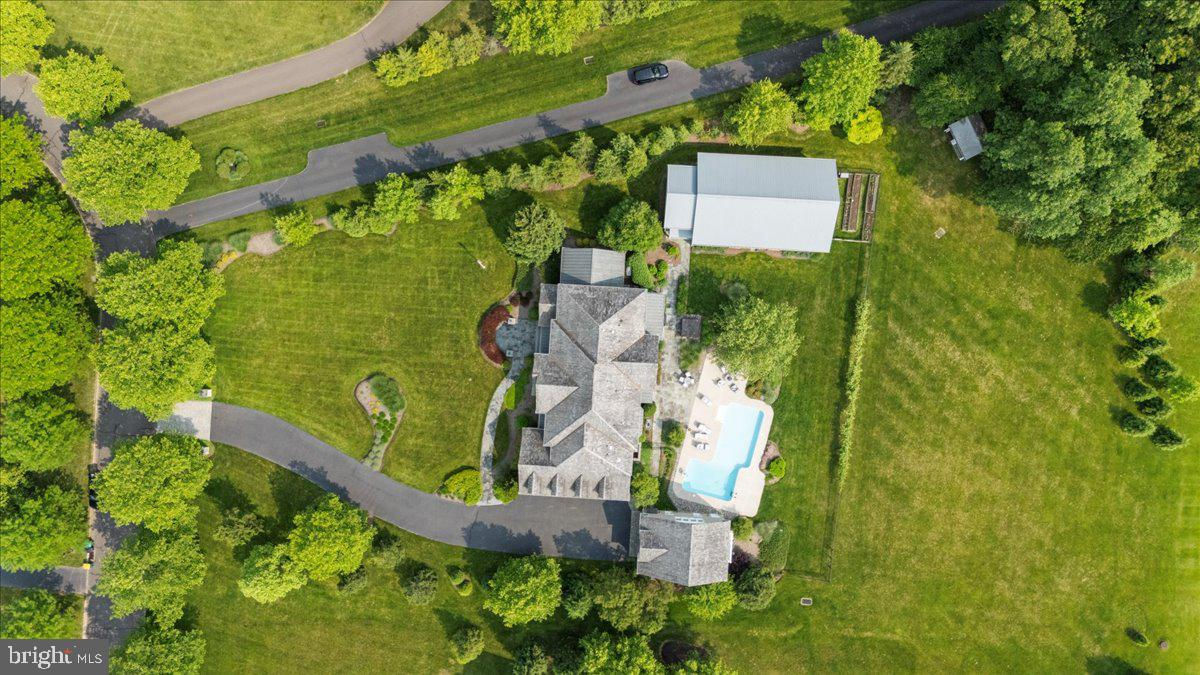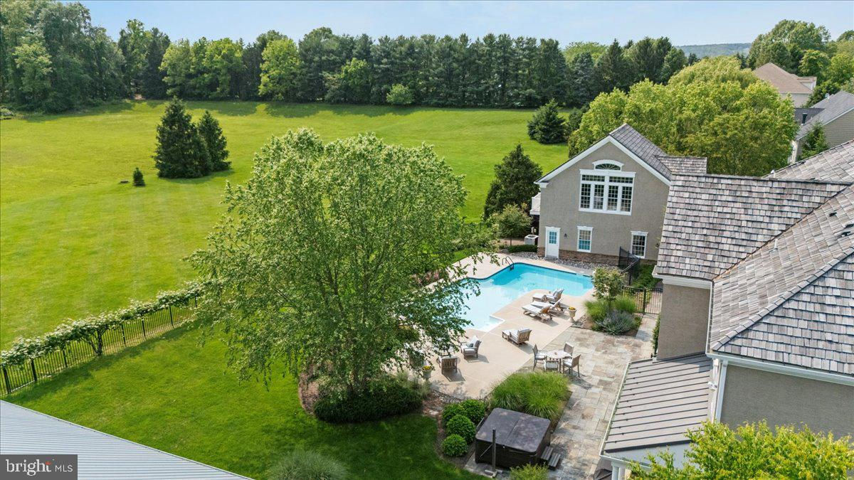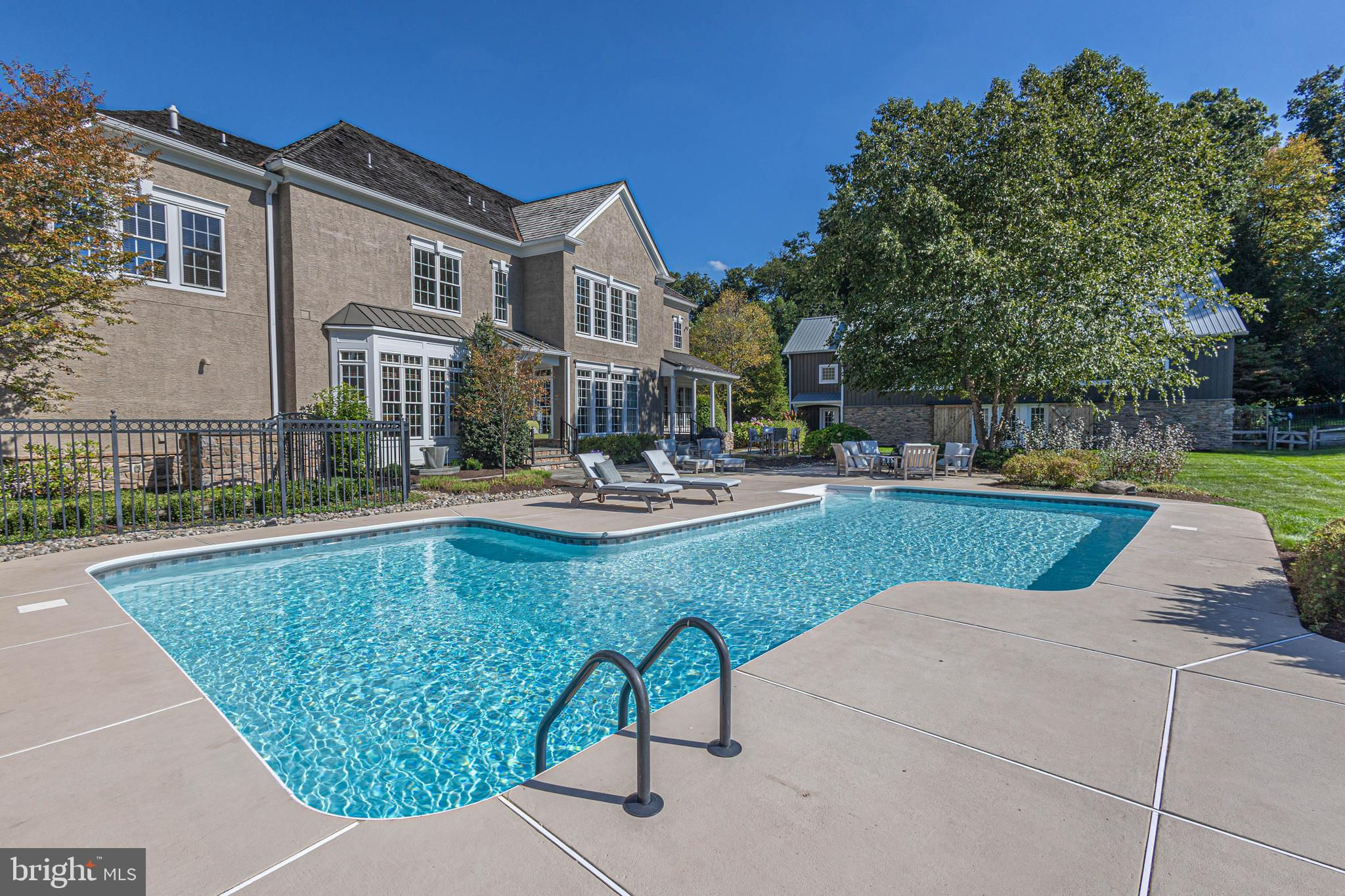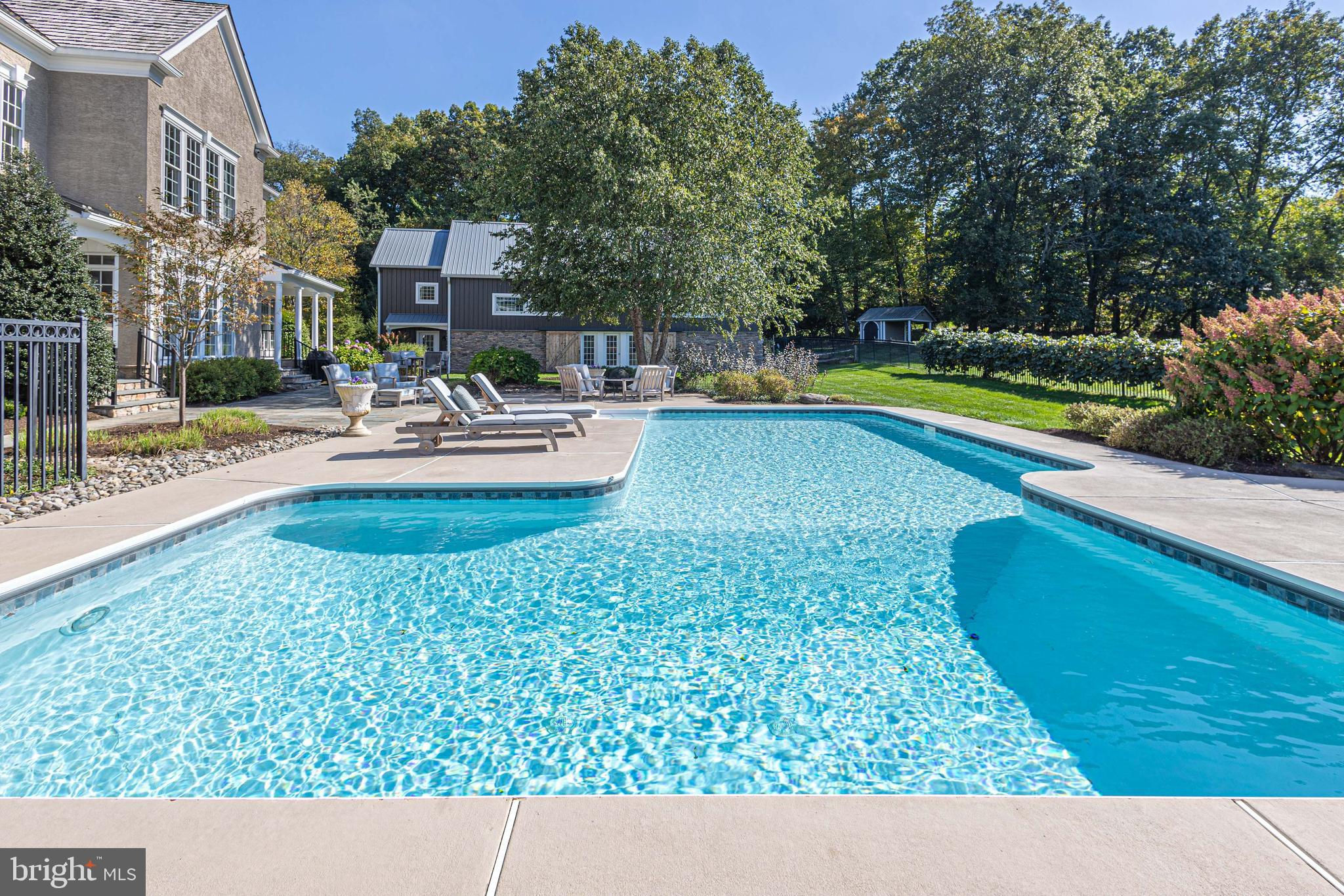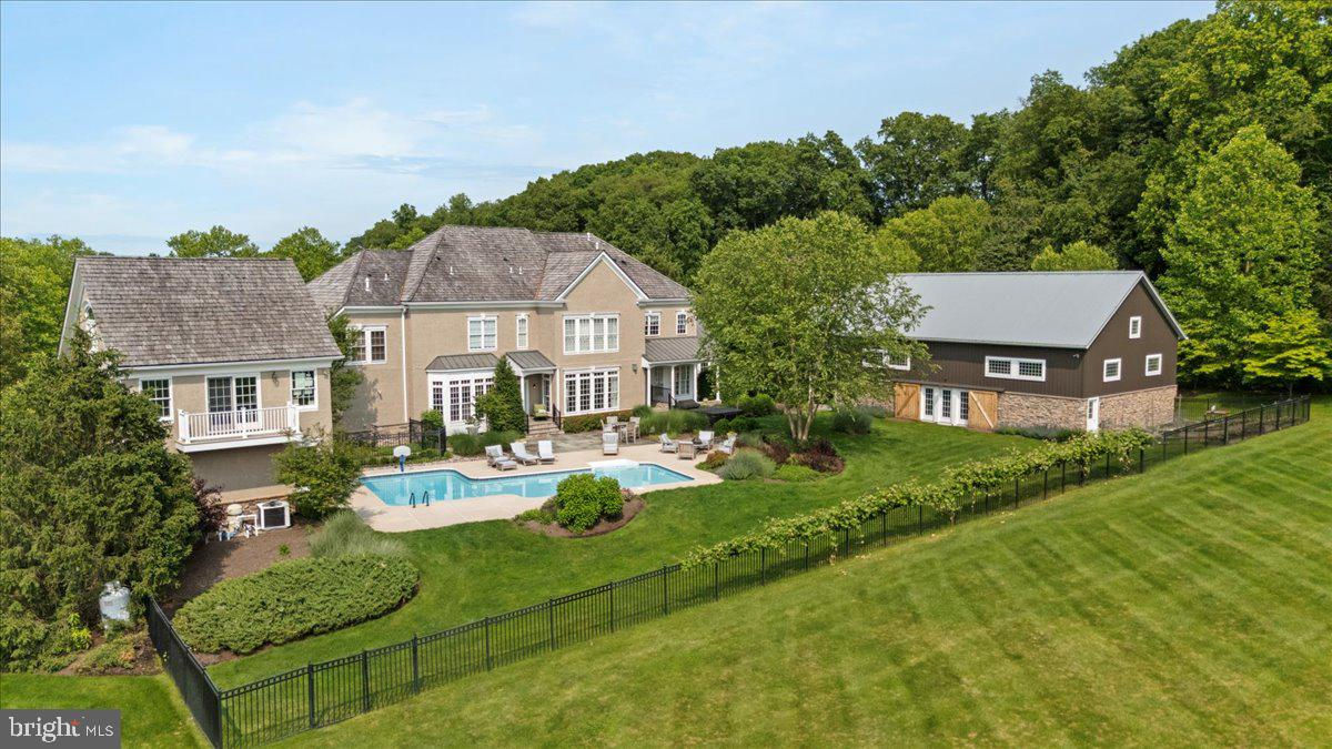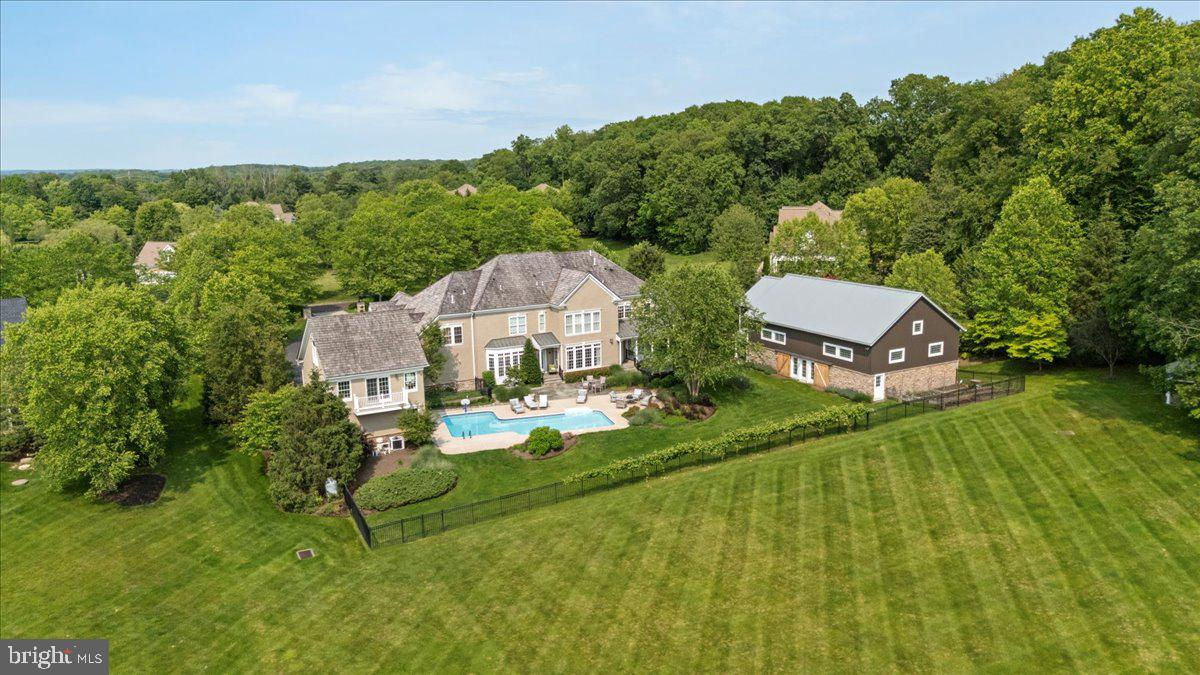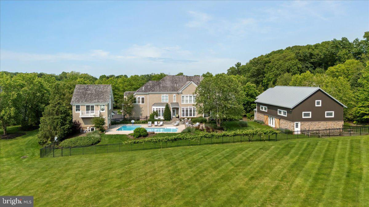 All we can say is WOW! You will not believe what this special property has to offer. Exquisite estate compound in Solebury, PA, located in the blue-ribbon New Hope-Solebury School District. Comprising of 3 buildings on two acres backing to 5 additional acres of open preserved space and a tree farm, the property includes: a 6-bedroom, 6 full and 2 half-bath residence with walk-in closets, formal living, dining and family rooms, chef’s kitchen with Wolf 6-burner double oven & dual Sub-Zero refrigeration, sunroom, home office, two laundries and a fully finished basement with additional family room, flex room, gym, and storage; 4 car attached garage, another detached 2 car garage with spacious office above (792 s.f.) with fireplace, pool storage; a fully conditioned versatile accessory building (2,170 s.f.) offering indoor basketball, pickleball, volleyball, hitting cage, and big-screen TV area. Manicured grounds feature heated in ground pool, bluestone hardscaping, full security & camera system, sprinkler system, natural gas generator (no buried tanks), well & septic. A rare opportunity for multi-use luxury, recreation, and work-from-home all in one private, meticulously maintained Bucks County estate. This homesite captures the essence of exclusivity; a super private, southern-exposed backyard sanctuary seamlessly set within an upscale community.