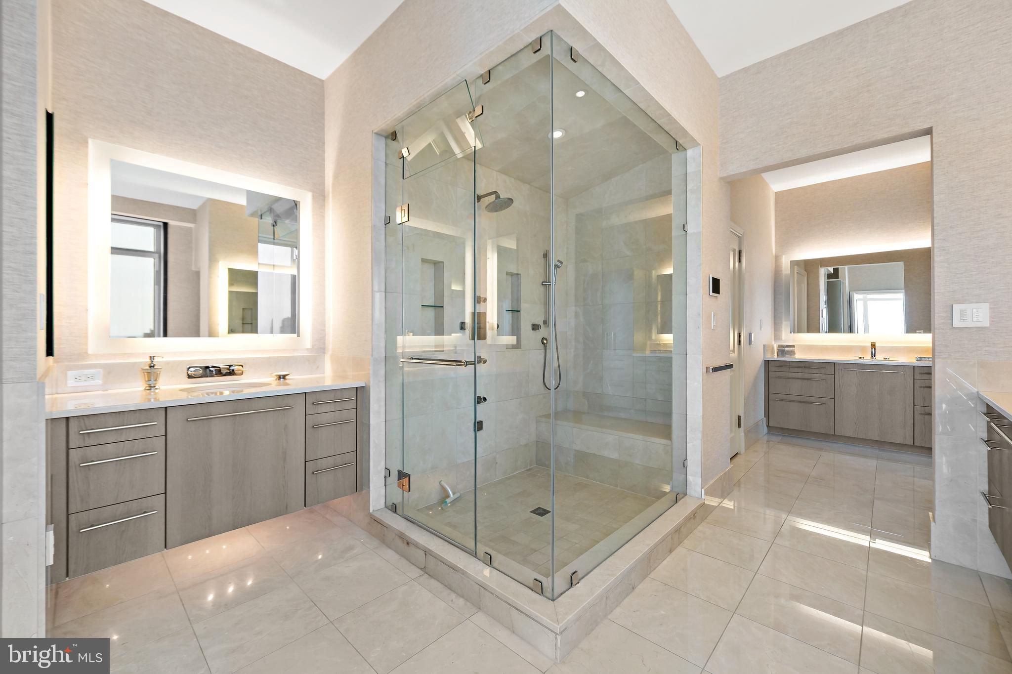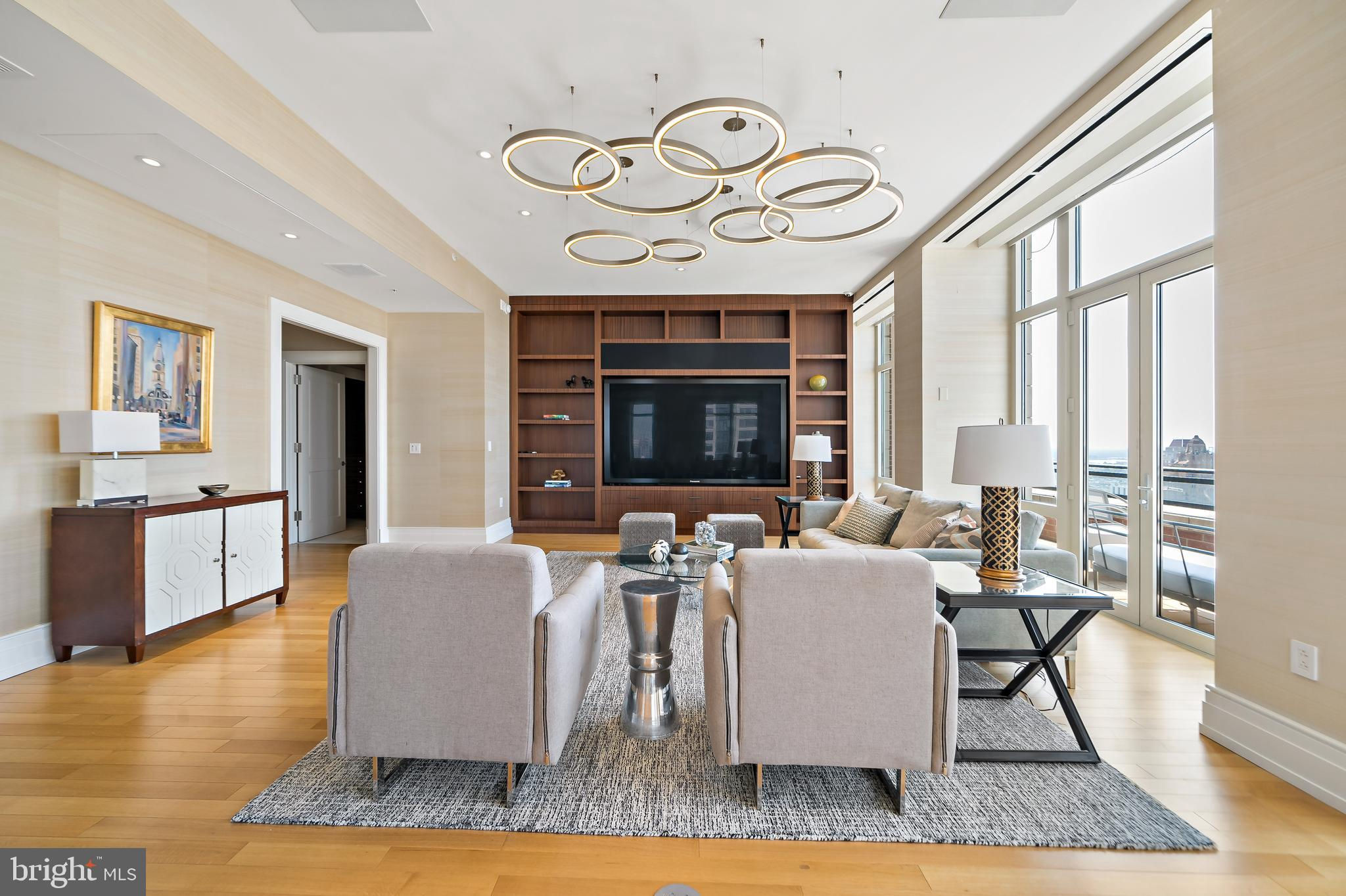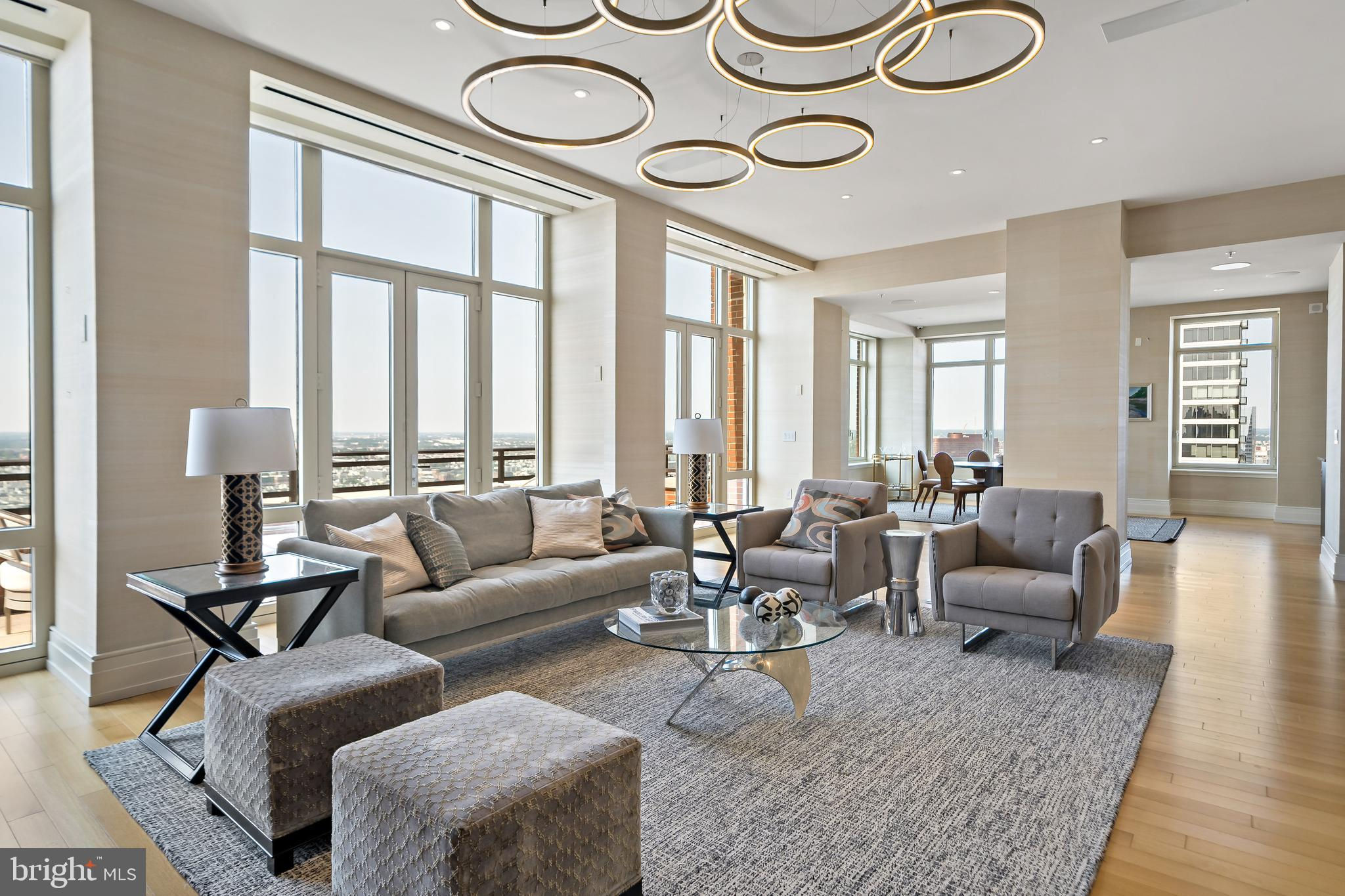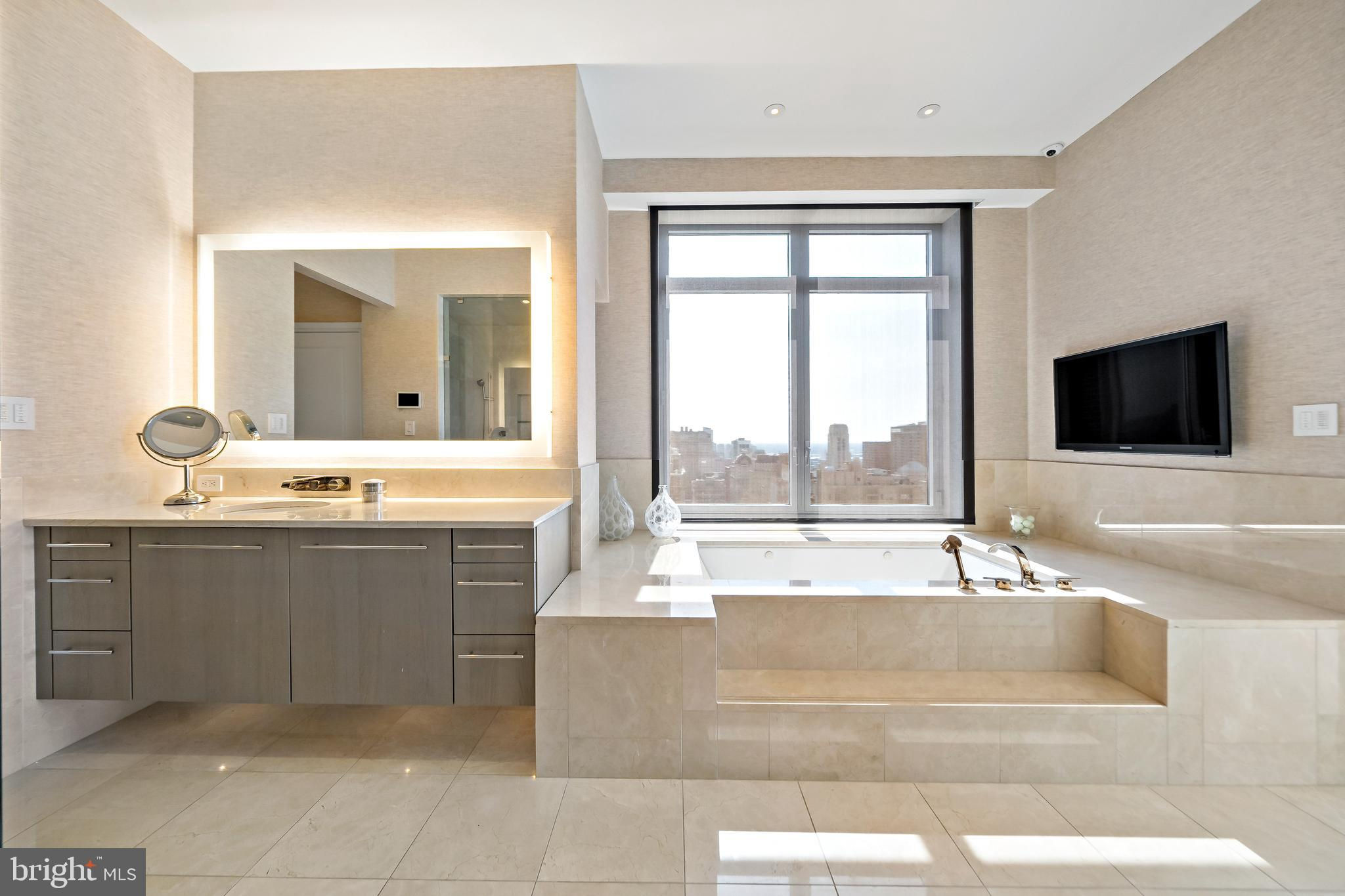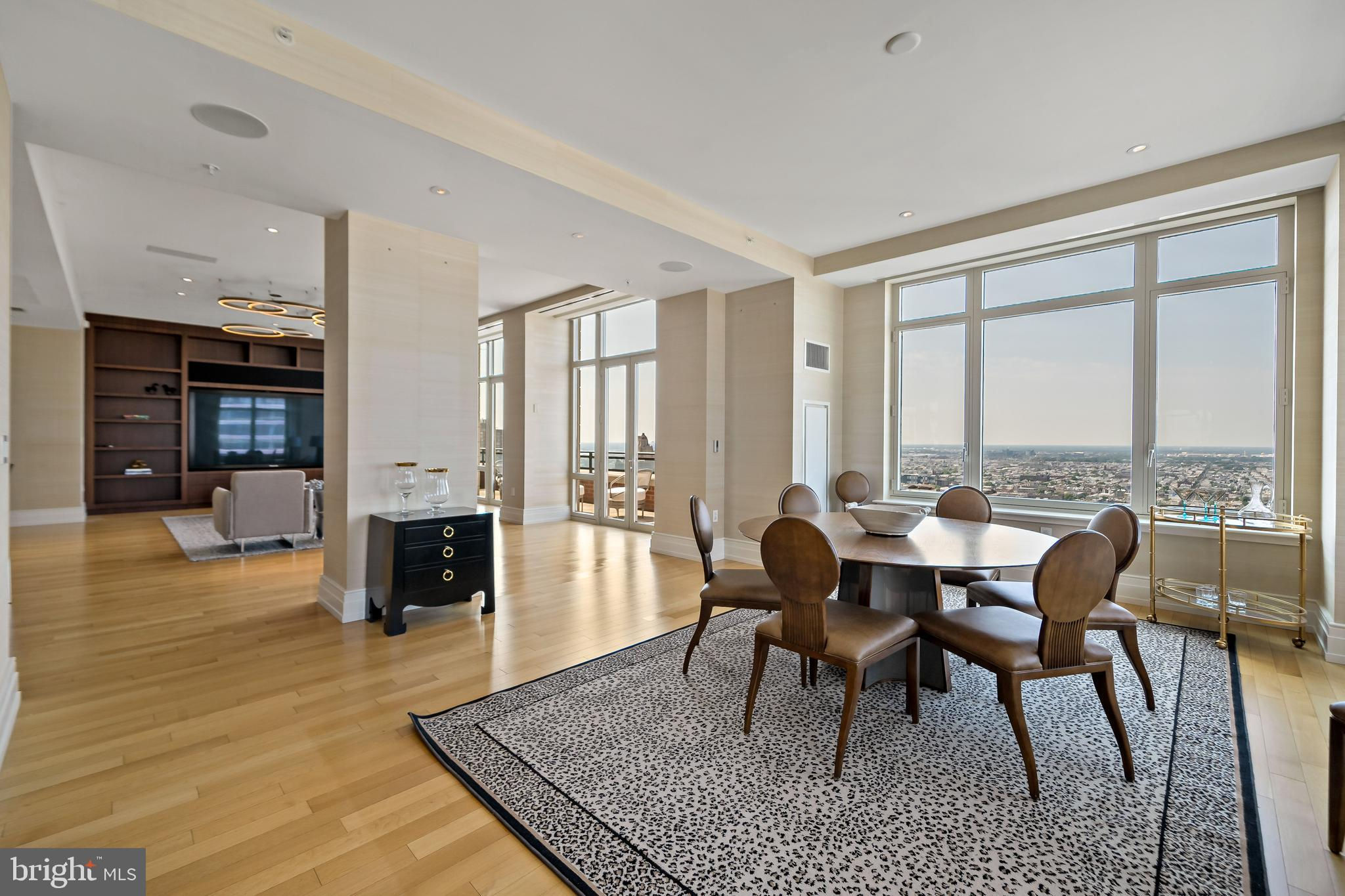 Welcome to Unit 3102 at 10 Rittenhouse, an extraordinary nearly full-floor residence offering approximately 5,400 square feet of refined, light-filled living space high above Rittenhouse Square. This home delivers the scale and comfort of a modern townhome, elevated by the white-glove amenities and prestige of one of Philadelphia’s most iconic buildings. An incredibly rare offering, the unit includes four garage parking spaces—two of which are the ultra-coveted self-park spots located within the building’s garage, along with two additional valet spaces, providing flexibility and convenience that is nearly impossible to find in Center City. Inside, the residence opens to sweeping 270-degree skyline views centered on Rittenhouse Square, visible through floor-to-ceiling glass double doors and three separate balconies. Natural light fills every room, creating a sense of openness and calm that is matched by the clean, contemporary design throughout. The main living and entertaining areas are expansive and welcoming, anchored by a custom-built wall unit that houses a 100" television and includes a hidden door accessing the AV closet. It is complemented by a beautifully designed bar equipped with a wine fridge, ice maker, sink, and a truly massive walk-in pantry that functions as a secondary prep space or staging area for entertaining. The dining area is perfectly positioned just off the kitchen, facing southwest, where you’ll enjoy open, unobstructed corner-window views that stretch toward the skyline and flood the space with golden afternoon light. The flow from kitchen to dining to living is effortless and designed for both large-scale entertaining and intimate daily living. The primary suite is a retreat all its own—thoughtfully laid out and filled with soft natural light. It features three dedicated closets, including two walk-ins and a spectacular L-shaped dressing closet with an east-facing window. The spa-style bathroom includes a separate water closet, a jetted soaking tub with an east-facing window and wall-mounted TV for cozy baths, and two separate vanities. Just beyond the dressing room is a third vanity, ideal for makeup or grooming. The enormous walk-in closet, fully customized by California Closets, feels worthy of a magazine feature. Past the dressing room, a tranquil home office space offers complete privacy, ideal for focused work or quiet reflection, and opens to its own east-facing balcony with morning light and city views. Two additional bedroom suites are located off a den on the west side of the home. Each includes an en-suite bathroom and generous closets, offering flexibility for guests, family, or remote work setups. There are two separate laundry areas—one tucked discreetly into the primary suite and another off the kitchen—adding function and convenience to daily living. The entire residence is equipped with a range of powered sunshades, blackout shades, and draperies, and features a fully customized Lutron lighting system. More than a dozen zoned climate controls ensure year-round comfort, room by room. Living at 10 Rittenhouse includes access to five-star amenities and services, including 24/7 concierge, a state-of-the-art fitness center, indoor pool, hospitality suite, chauffeur-driven house vehicle, and more. The building's discreet entrance on 18th Street places you just steps from the city’s best dining, shopping, and cultural institutions. This is a rare opportunity to own one of the most spacious, private, and refined residences in the city—designed for those who value scale, light, and luxury at the highest level.