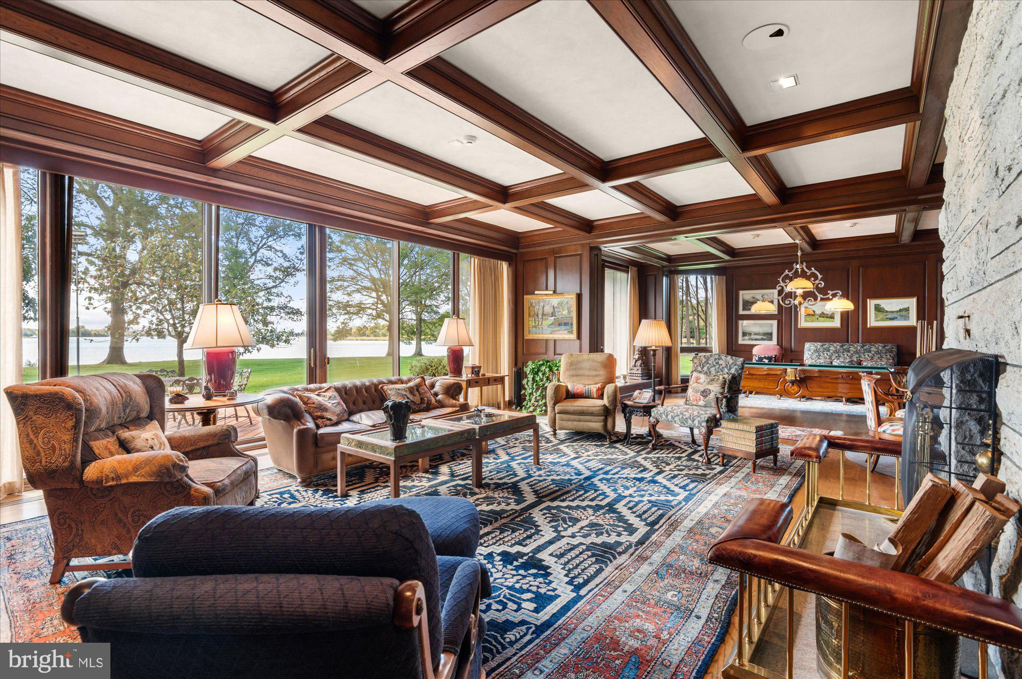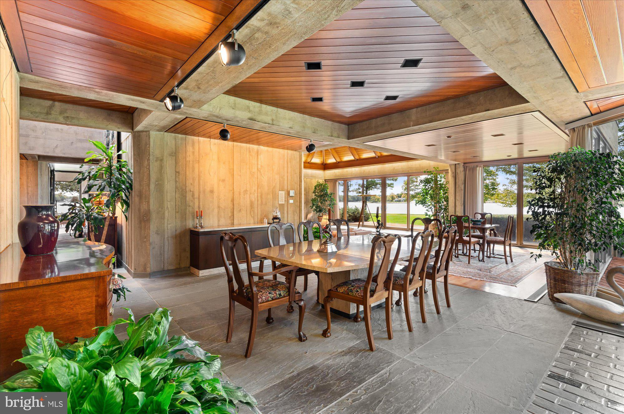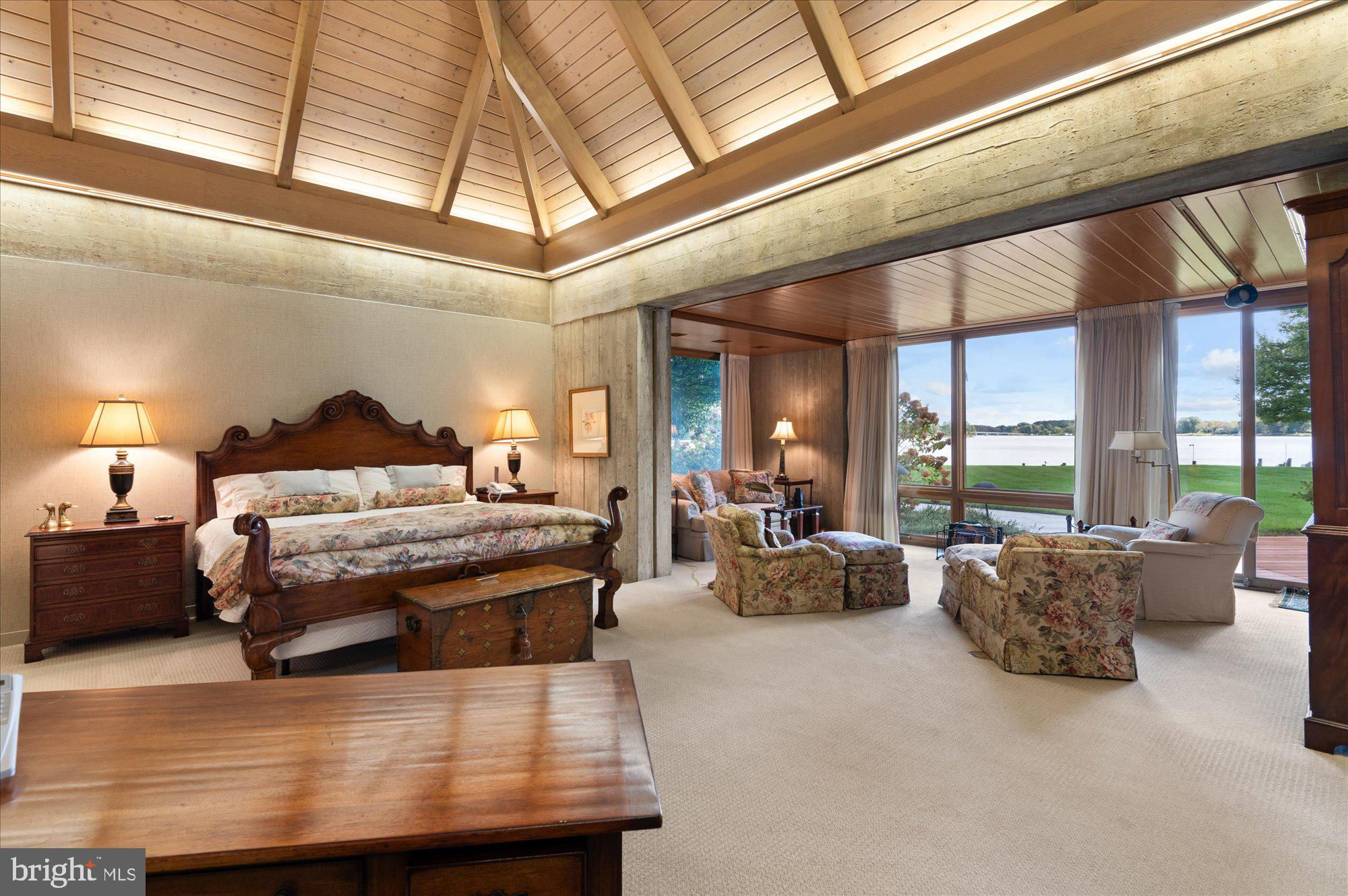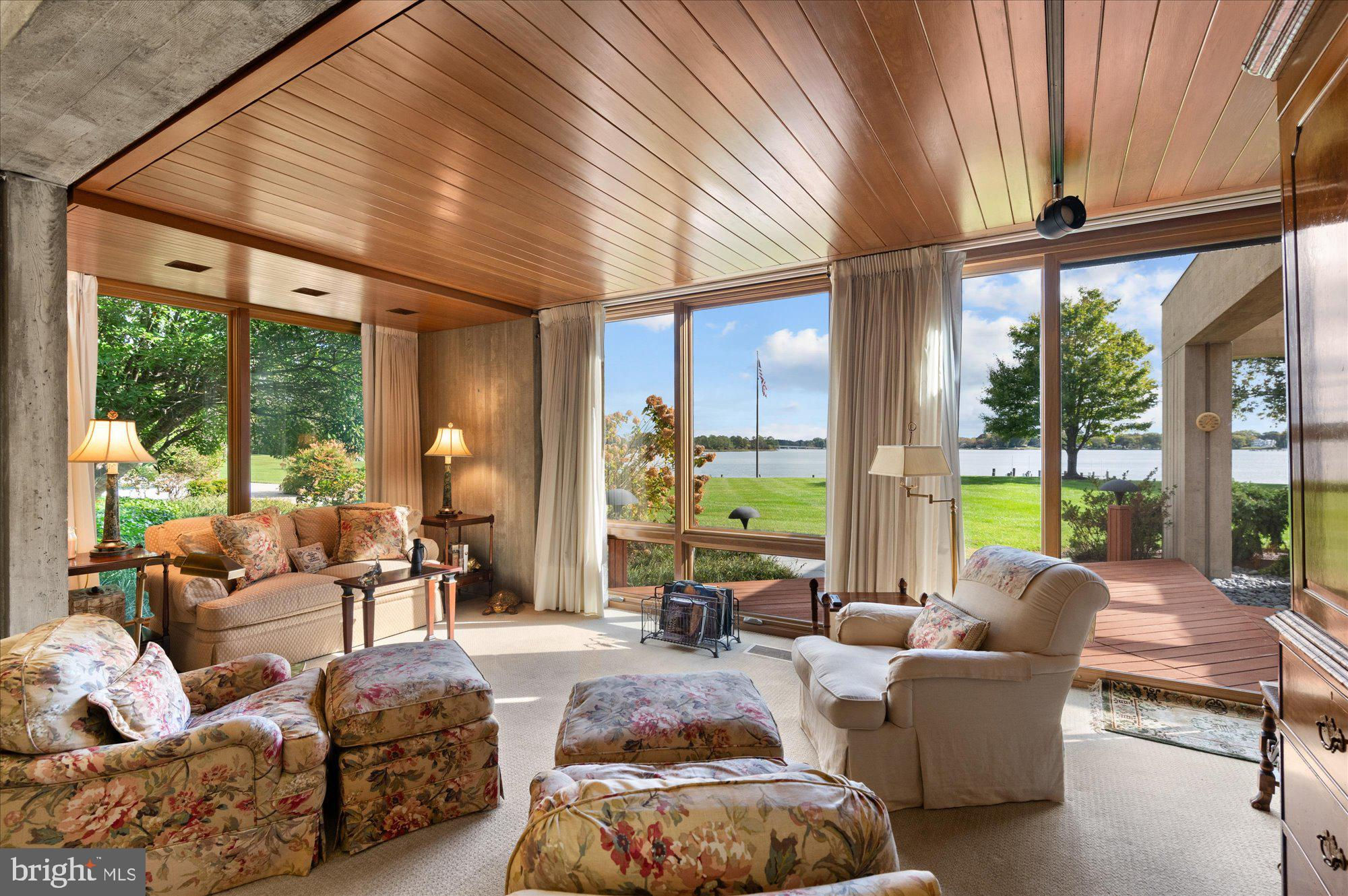 Welcome to Sunnyside, an exceptional and rare waterfront estate situated on a spectacular 16-acre point along the majestic Miles River. A picturesque, winding driveway leads to the one-of-a-kind contemporary home, built by A. James Clark for his family. Completed in 1978, Sunnyside was the culmination of a 3-year collaboration between the legendary builder and philanthropist, his son, architect Paul Clark, and prominent DC architect, John Henry Sullivan. Mr. Clark hand-picked every remarkable detail on the property, from the materials to the craftsmen, many of whom would later join him to form the iconic Clark Construction. Meticulously maintained over the years, the main house features floor-to-ceiling windows throughout offering stunning water views from every room. The thoughtfully designed layout of the main level easily accommodates both large and intimate gatherings. Highlights include a striking 24ft x 24ft sun-drenched atrium, an expansive main level primary bedroom suite complete with its own fitness room and sauna, 4 fireplaces, a living room with 20ft+ tall ceilings, a greenhouse, and a temperature-controlled wine room. The Great Room, the perfect spot for a casual gathering with friends and family, boasts striking custom woodwork throughout and incredible expansive western views of the property. The second-floor features three bright and sunny bedrooms, each with their own private bathroom, balcony, fireplace, heating systems, and distinctive views of the Miles River. The portico along the front of the home leads to an easily accessible, but completely private guest house with its own cozy living room, bedroom, full bath, fireplace, and kitchenette. Just outside the main house with idyllic garden and river views is the pool with its own full bath. The tennis court, livestock barn, and equipment barn are just a short stroll through the carefully designed and bucolic landscape. Resting on a point on the Miles River, Sunnyside boasts approximately 2000ft of waterfrontage, of which approximately 1550ft is riprapped. A 135ft deep-water pier (approx. 6 ft MLW) offers 2 boat lifts. Less than 10 minutes to Downtown Easton and just a short boat ride (or less than 15 minutes by car) to St. Michaels, legendary Sunnyside proudly sits at the heart of Maryland’s Eastern Shore.