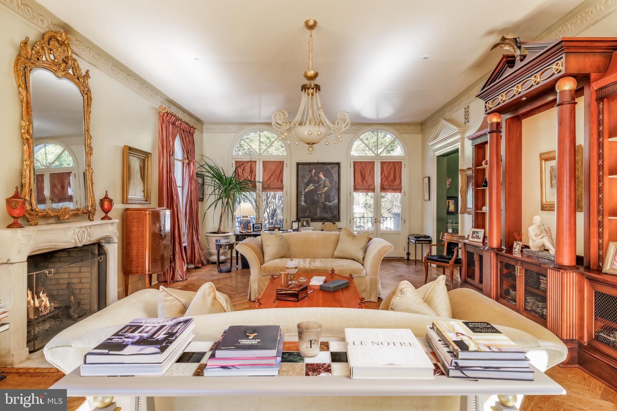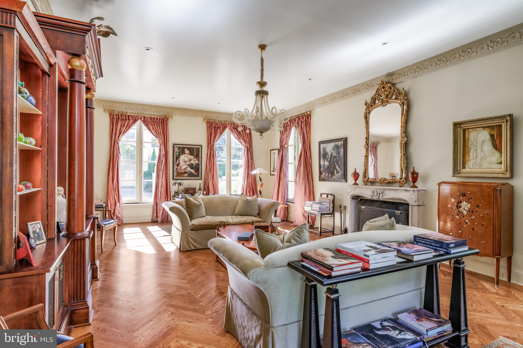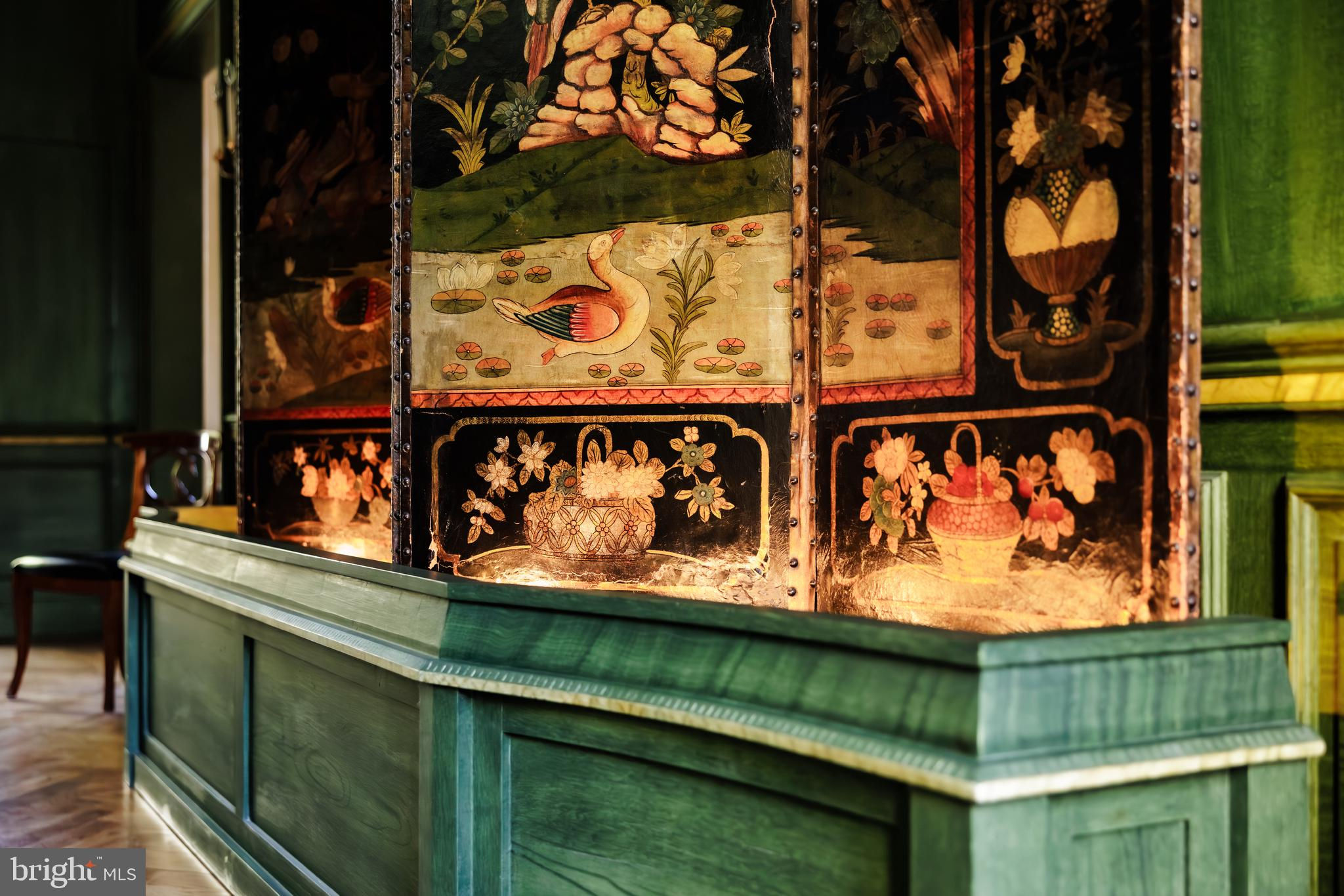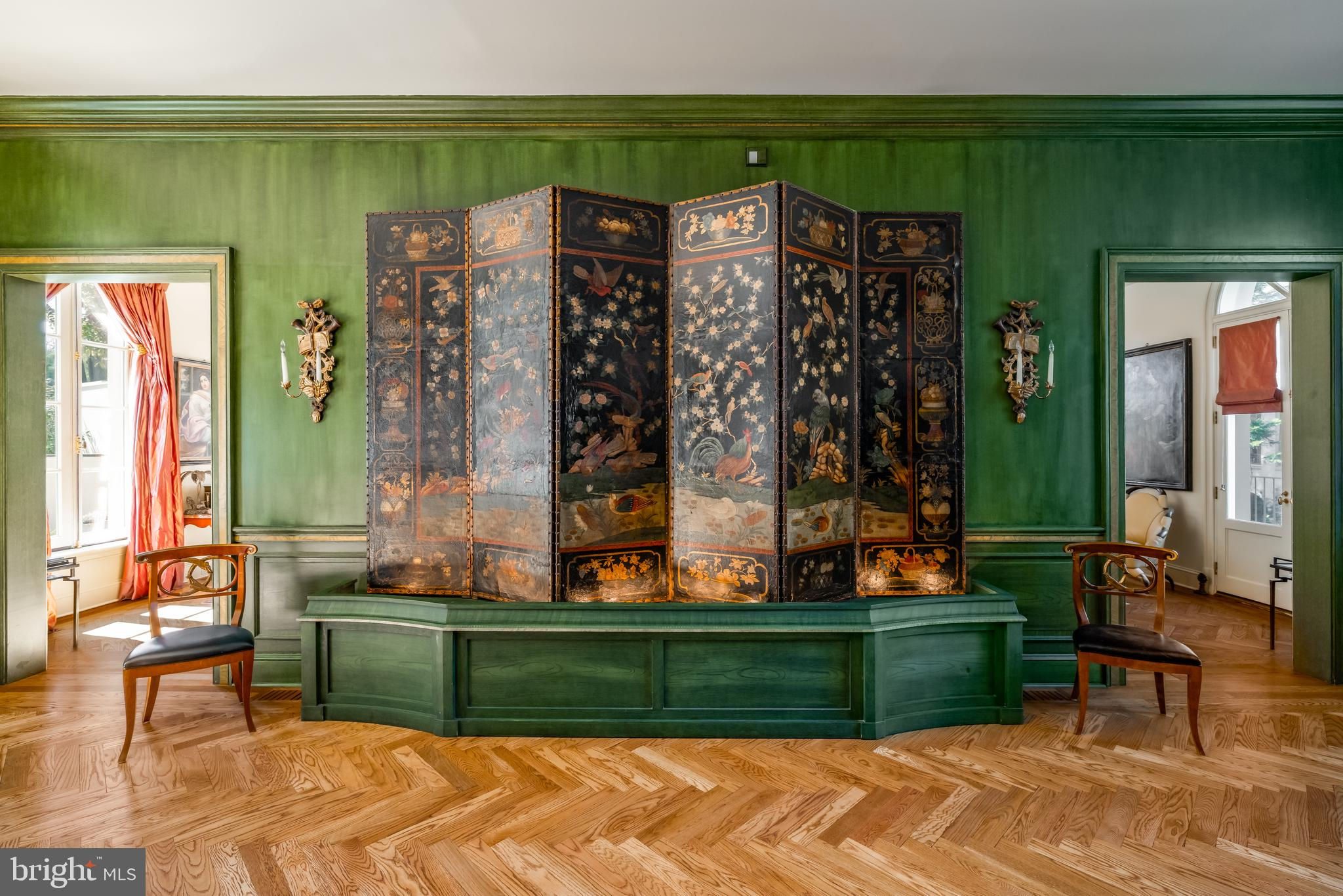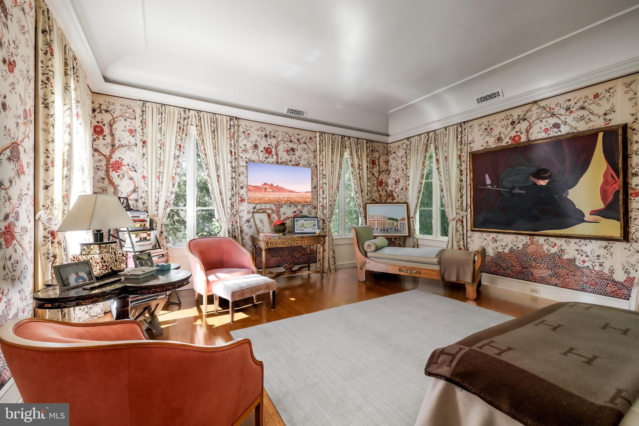 Branching off the prestigious Chain Bridge Road NW is a hidden private drive. The hedge-lined path meanders through verdant foliage to reveal a walled, circular pea gravel motor court upon which sits an elegant estate home. Evoking cues from the most vaunted European country homes – part Tuscan villa and part French provincial – the estate was created from the ground up by its visionary owner-developer. Constructed out of cinder block with thick walls and a recently refinished triple-coat stucco exterior, the home is a true fortress of luxury. Stepping beneath the lofty portico and through arched double doors reveals the grand gallery, spanning the entire depth of the home. Hand-painted in a striking faux green finish by British artist Malcolm Robson to complement refinished herringbone floors, it sets the tone for the formal spaces. Soaring 11-foot ceilings, 8-foot solid mahogany doors, and elaborate P.E. Guérin hardware — including custom windows with crémone fittings — are testaments to the level of detail throughout. The formal living room boasts custom plaster crown molding and an 18th-century French limestone fireplace mantle. Spanning 32 feet, it opens onto the rear terrace via twin sets of French doors. A 19th-century French marble fireplace mantle anchors the formal dining room, enhanced by mahogany paneling and Braquenié curtains in the La Rivière Enchantée pattern. Recently expanded, the chef’s kitchen is divided into prep and cooking areas: one traditional, the other contemporary. Viking, Sub-Zero, Miele, and Gaggenau appliances represent top-of-the-line offerings, including six burners. A mahogany breakfast room completes the main level. A vestibule leads to the upper-level primary wing. The bedroom features a raised pearl white ceiling and 18th-century Braquenié Le Grand Génois floral-patterned padded walls. The bath offers checkered marble floors, dual vanities, a jetted soaking tub, walk-in shower, and separate water closet. A wraparound dressing room with built-ins and track lighting completes the suite. Two additional ensuite bedrooms are uniquely styled. The large lower-level recreation room opens through three sets of French doors to a parklike rear lawn. The exterior features a covered flagstone terrace, central lawn, al fresco dining area, and a custom stone pond set against a pergola with lattice fencing. Privacy is enhanced by a bamboo enclosure. A fourth bedroom with kitchenette and full bath can serve as a suite, with laundry and storage nearby. HVAC systems include a 2023 Carrier unit for the main and lower levels, and a heat pump for the upper level. The hot water heater was replaced in 2024. A central vacuum system and new main-level glazing further enhance comfort. Across the motor court is a separate carriage house with an inlaid cobblestone entrance, three-car garage, workshop, storage space, and trash room. Upstairs, the guest suite includes a kitchenette, full bath, living area, washer/dryer, dedicated HVAC, and private terrace. Passionately designed, meticulously crafted, and situated in one of Washington’s most coveted enclaves, 2740 Chain Bridge Road NW is more than an estate — it is a masterwork of timeless European elegance and enduring architectural integrity. Rarely does a residence so completely embody privacy, provenance, and purpose. This is a home for the discerning few — a legacy property that will continue to inspire for generations to come.