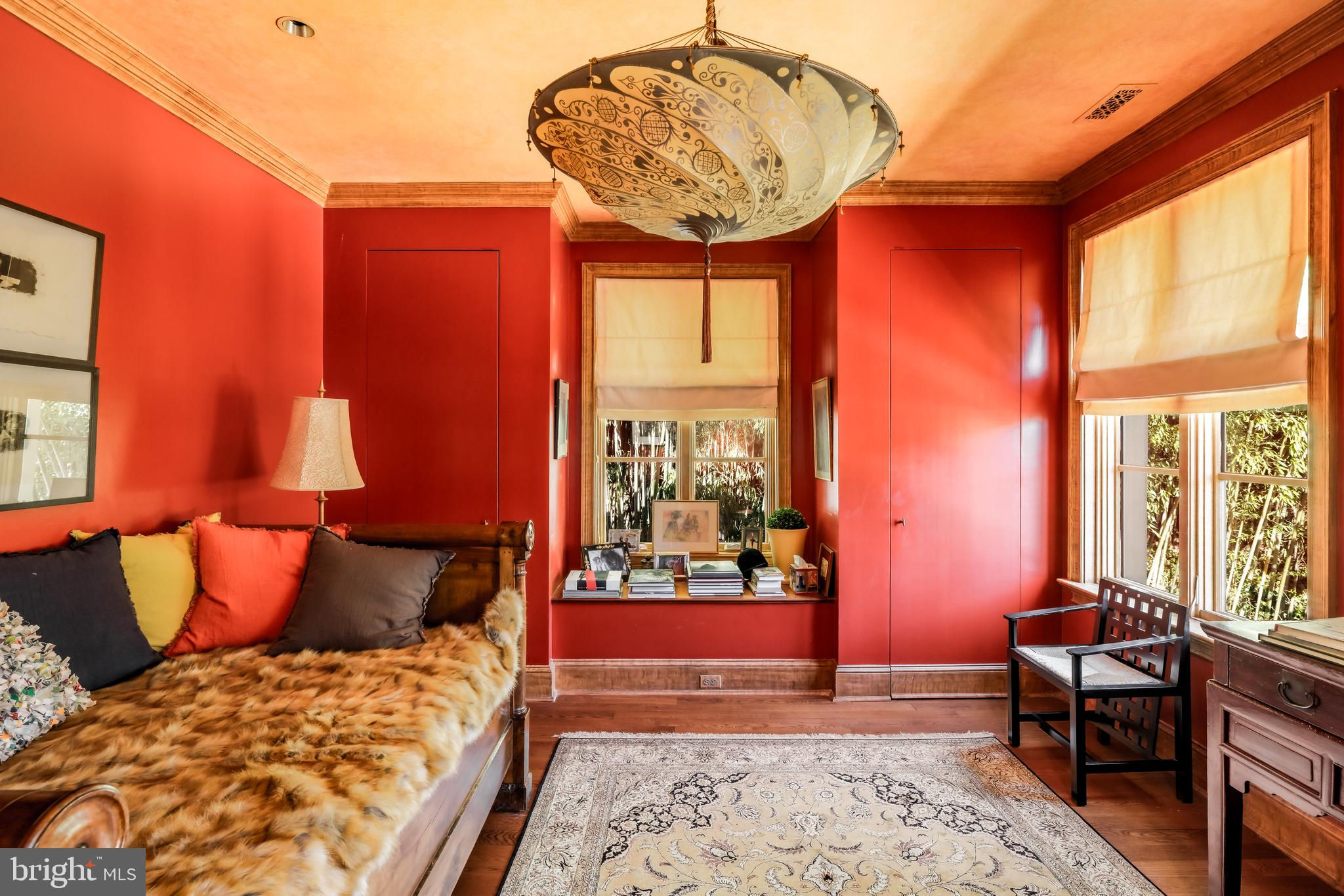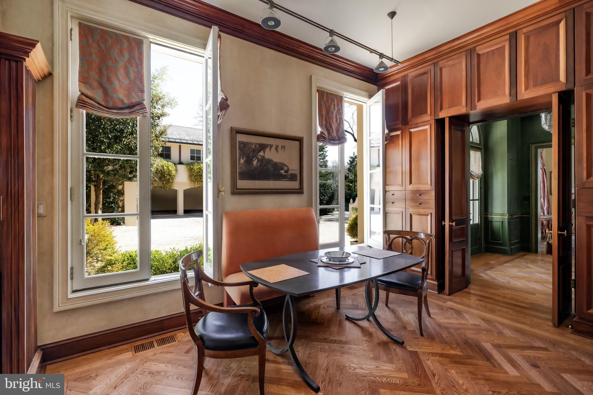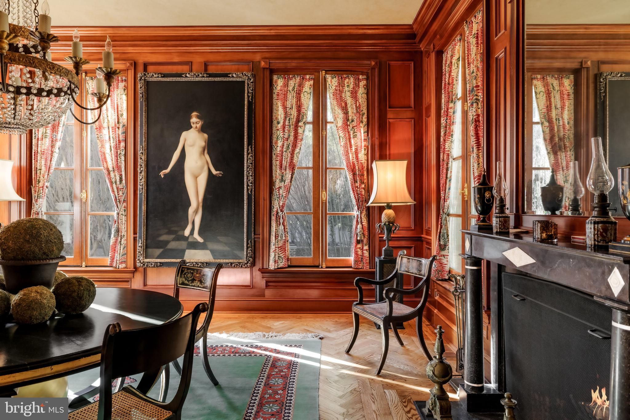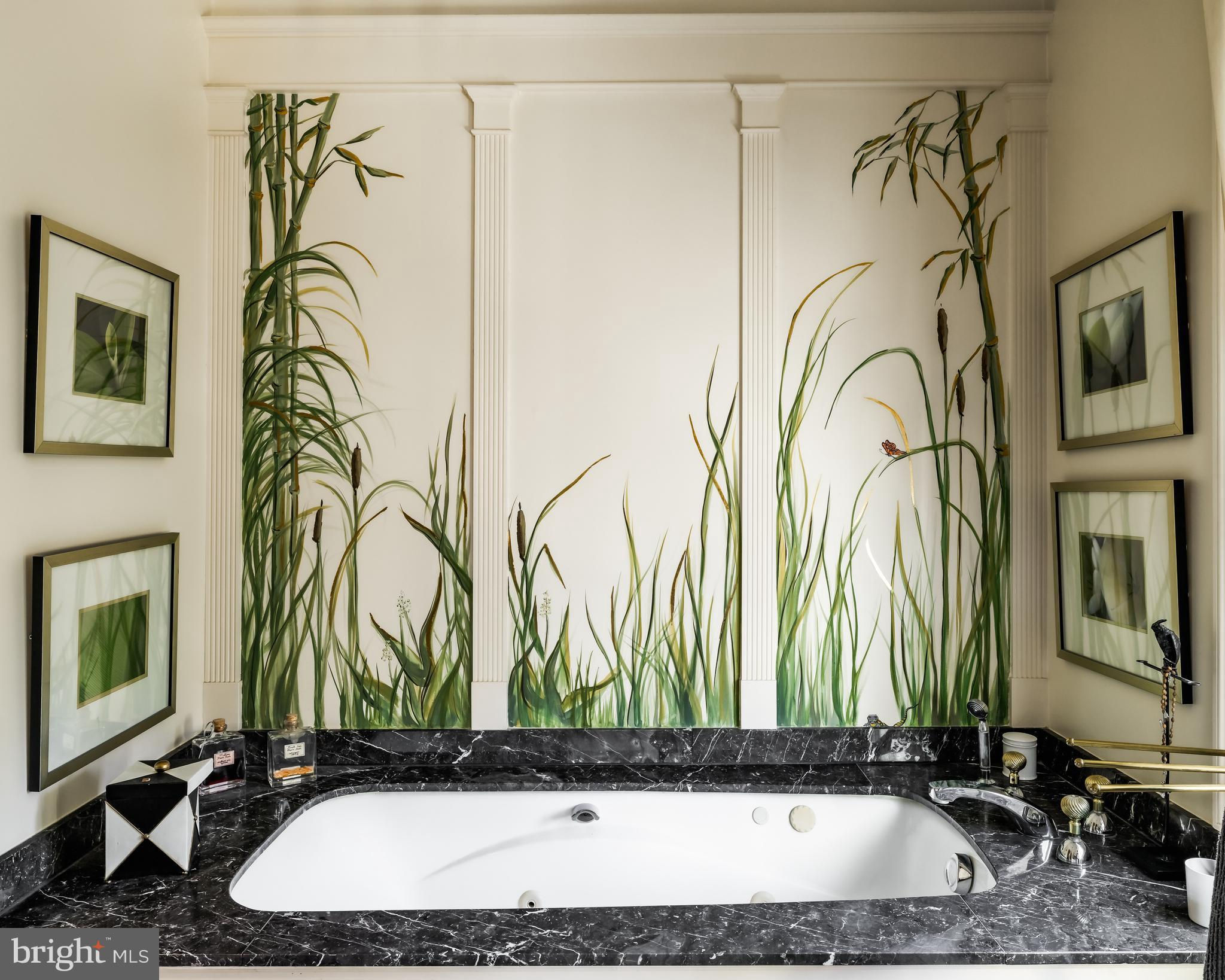 Branching off the prestigious Chain Bridge Road NW is a hidden private drive. The hedge-lined path meanders through verdant foliage to reveal a walled, circular pea gravel motor court upon which sits an elegant estate home. Evoking cues from the most vaunted European country homes – part Tuscan villa and part French provincial – the estate was created from the ground up by its visionary owner-developer. Constructed out of cinder block with thick walls and a recently refinished triple-coat stucco exterior, the home is a true fortress of luxury. Stepping beneath the lofty portico and through arched double doors reveals the grand gallery, spanning the entire depth of the home. Hand-painted in a striking faux green finish by British artist Malcolm Robson to complement refinished herringbone floors, it sets the tone for the formal spaces. Soaring 11-foot ceilings, 8-foot solid mahogany doors, and elaborate P.E. Guérin hardware — including custom windows with crémone fittings — are testaments to the level of detail throughout. The formal living room boasts custom plaster crown molding and an 18th-century French limestone fireplace mantle. Spanning 32 feet, it opens onto the rear terrace via twin sets of French doors. A 19th-century French marble fireplace mantle anchors the formal dining room, enhanced by mahogany paneling and Braquenié curtains in the La Rivière Enchantée pattern. Recently expanded, the chef’s kitchen is divided into prep and cooking areas: one traditional, the other contemporary. Viking, Sub-Zero, Miele, and Gaggenau appliances represent top-of-the-line offerings, including six burners. A mahogany breakfast room completes the main level. A vestibule leads to the upper-level primary wing. The bedroom features a raised pearl white ceiling and 18th-century Braquenié Le Grand Génois floral-patterned padded walls. The bath offers checkered marble floors, dual vanities, a jetted soaking tub, walk-in shower, and separate water closet. A wraparound dressing room with built-ins and track lighting completes the suite. Two additional ensuite bedrooms are uniquely styled. The large lower-level recreation room opens through three sets of French doors to a parklike rear lawn. The exterior features a covered flagstone terrace, central lawn, al fresco dining area, and a custom stone pond set against a pergola with lattice fencing. Privacy is enhanced by a bamboo enclosure. A fourth bedroom with kitchenette and full bath can serve as a suite, with laundry and storage nearby. HVAC systems include a 2023 Carrier unit for the main and lower levels, and a heat pump for the upper level. The hot water heater was replaced in 2024. A central vacuum system and new main-level glazing further enhance comfort. Across the motor court is a separate carriage house with an inlaid cobblestone entrance, three-car garage, workshop, storage space, and trash room. Upstairs, the guest suite includes a kitchenette, full bath, living area, washer/dryer, dedicated HVAC, and private terrace. Passionately designed, meticulously crafted, and situated in one of Washington’s most coveted enclaves, 2740 Chain Bridge Road NW is more than an estate — it is a masterwork of timeless European elegance and enduring architectural integrity. Rarely does a residence so completely embody privacy, provenance, and purpose. This is a home for the discerning few — a legacy property that will continue to inspire for generations to come.