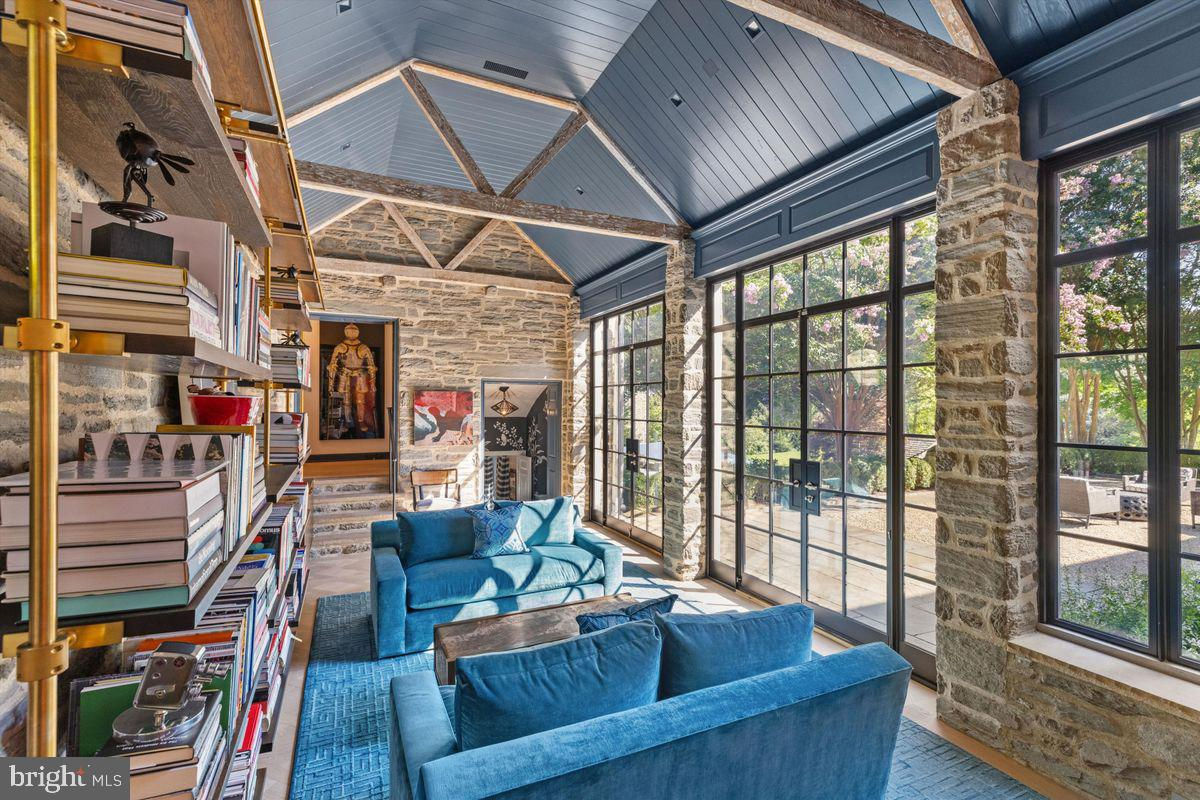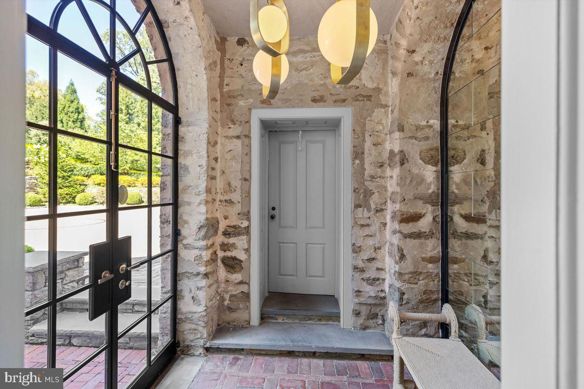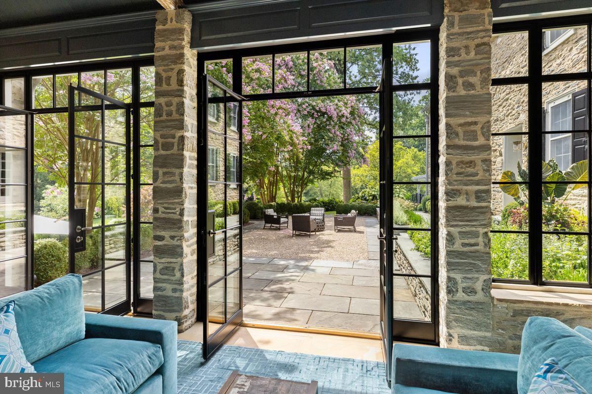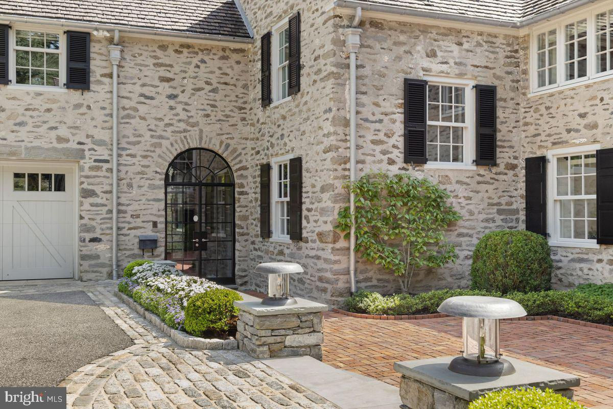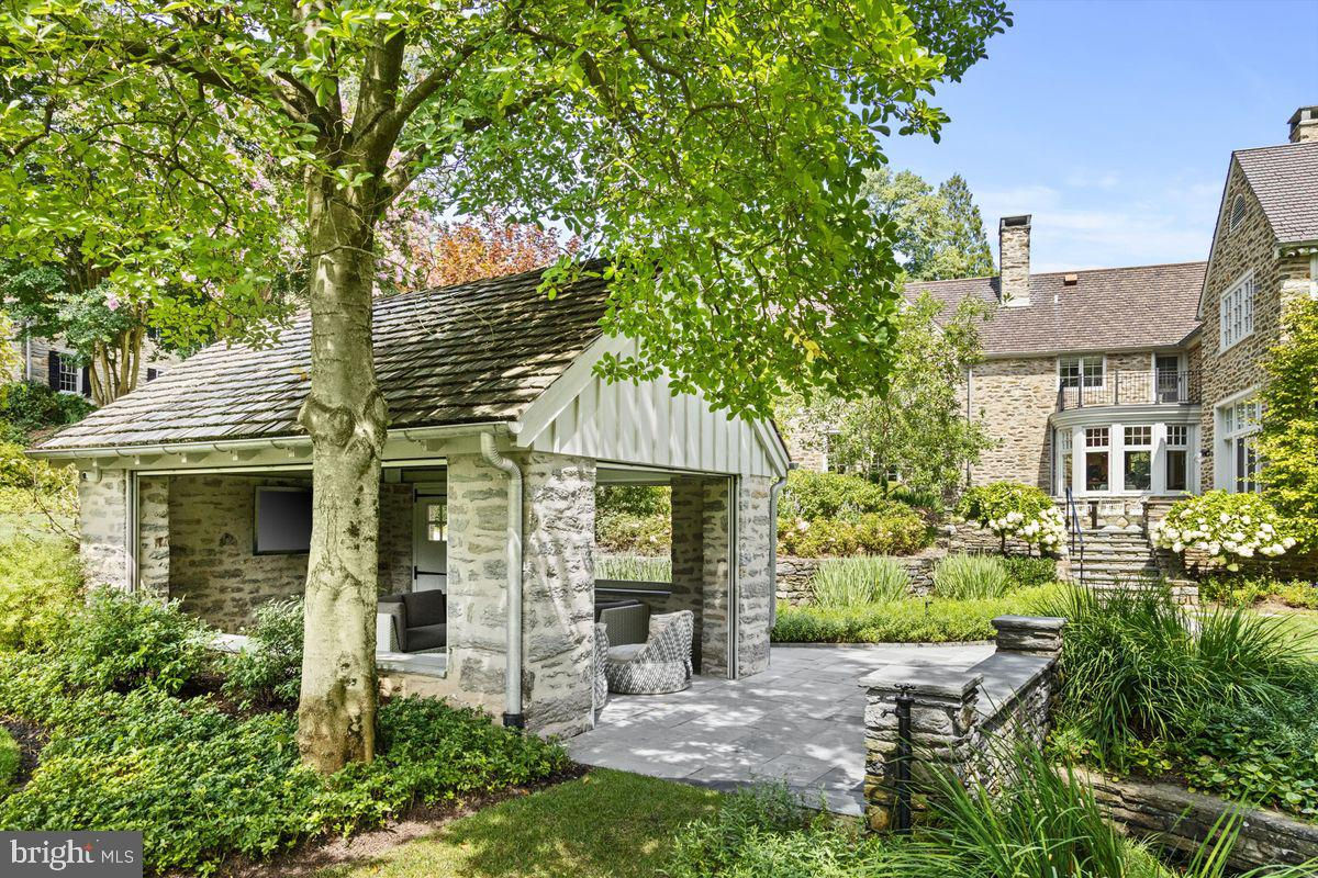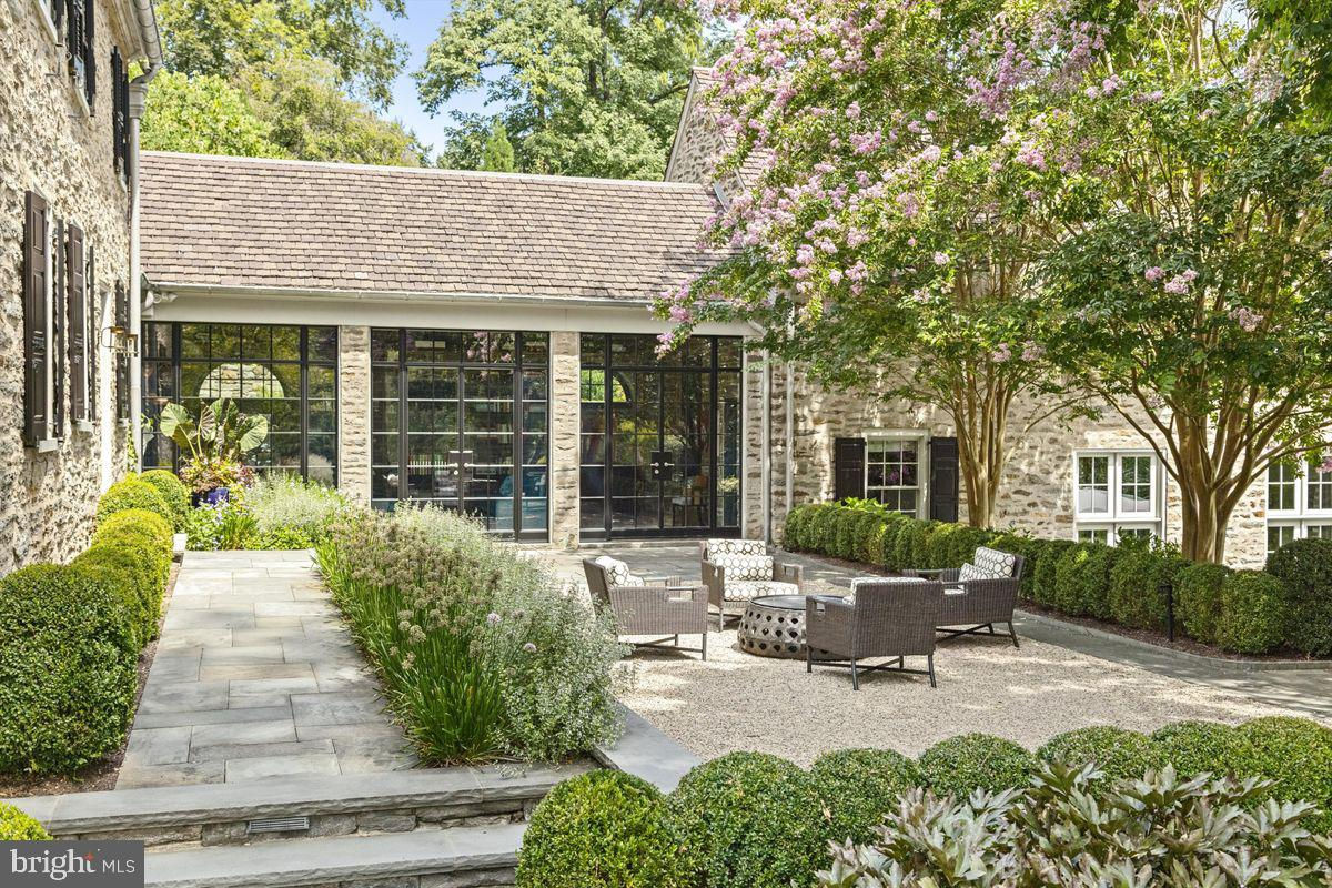 In the late 1700s, when Chestnut Hill was still many country miles outside of Philadelphia, a single-room-deep stone farmhouse was built in a valley where coldwater streams laced the forest floor. More than 200 years later, that simple stone house was seamlessly expanded by architect Peter Zimmerman into the best possible version of a classic Chestnut Hill stone home. Working with the terrain, Zimmerman created additions that blend organically into this most picturesque of settings. Beyond the immaculate parking courtyard and discreet navy blue main entry door lies a sophisticated, state-of-the-art residence. Beautifully designed for entertaining and daily living, the interior is a masterclass in color and pattern, infused with natural light and fresh energy unlike any other home in this sedate corner of Philadelphia. Interiors flow into outdoor garden “rooms,” each with a completely different feeling. Great care and much thought went into every space, from its reception area to the kitchen to its gathering spaces and private quarters upstairs. The house was completely gutted to incorporate all modern technological conveniences and amenities, including adaptive and remote lighting, temperature and security controls. Interior spaces were modernized and reorganized to accommodate lifestyle and entertaining requirements. This level of planning has resulted in a home that is aesthetically stunning and also easier to maintain and manage. The new site plan, which includes a pool, allows for sweeping views of the upper portion of the property as well as long vistas from nearly all of the interiors. As it flowed hundreds of years ago, the babbling brook is still there, well managed thanks to smart site engineering, flowing into and then out of a renovated springhouse into a large pond at the end of the property. A grass-covered stone walking bridge opens each side of the pond for long strolls around the property, creating the finishing touch to this private world that feels light years away from the city.