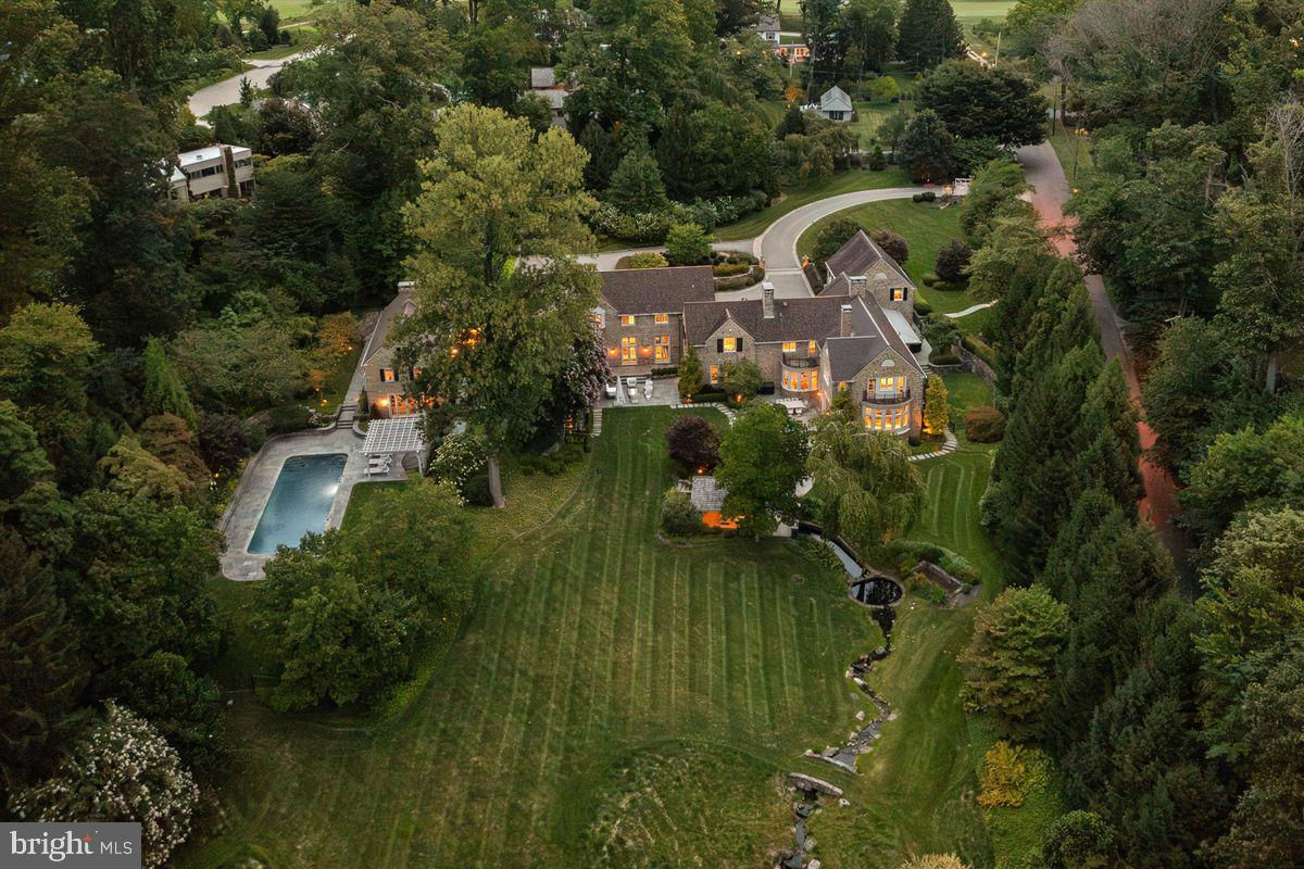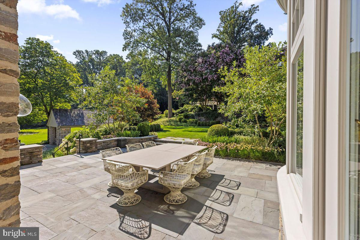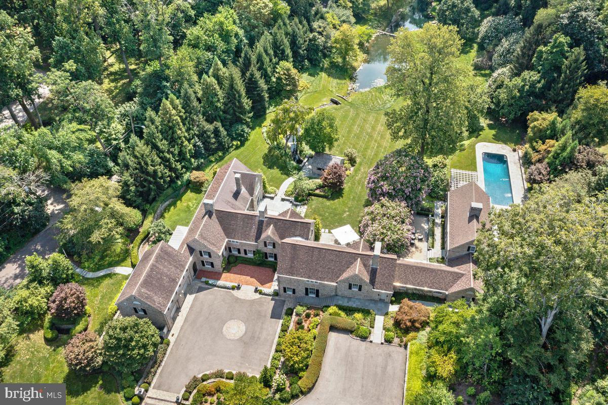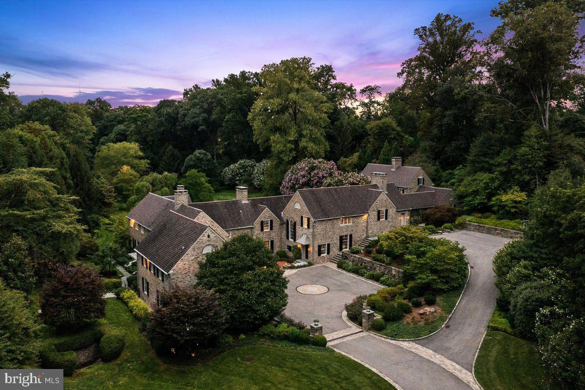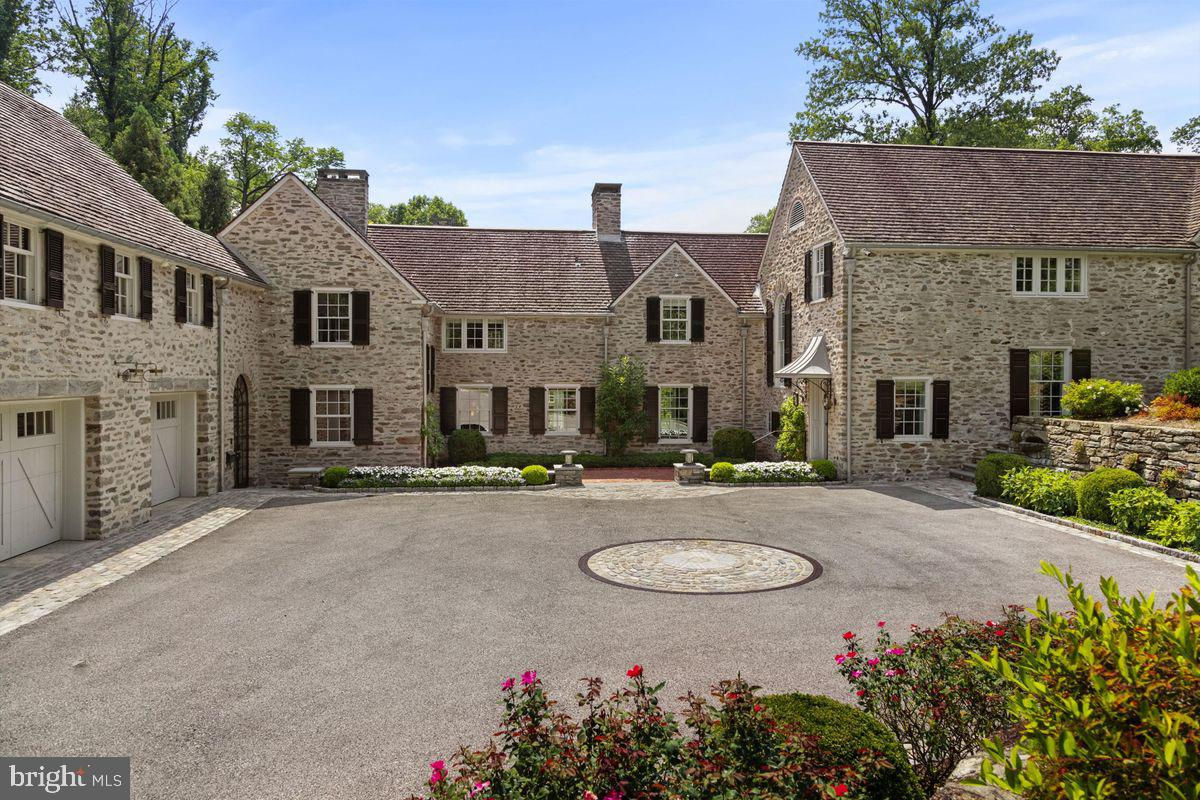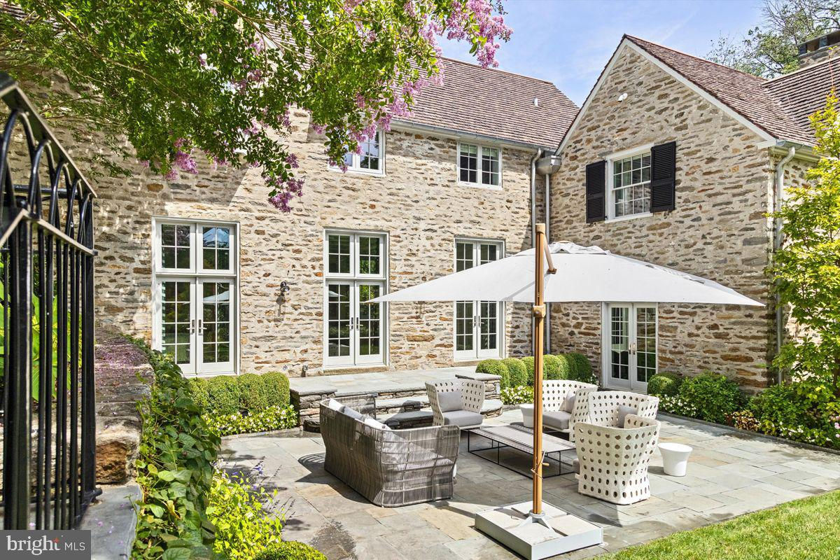 In the late 1700s, when Chestnut Hill was still many country miles outside of Philadelphia, a single-room-deep stone farmhouse was built in a valley where coldwater streams laced the forest floor. More than 200 years later, that simple stone house was seamlessly expanded by architect Peter Zimmerman into the best possible version of a classic Chestnut Hill stone home. Working with the terrain, Zimmerman created additions that blend organically into this most picturesque of settings. Beyond the immaculate parking courtyard and discreet navy blue main entry door lies a sophisticated, state-of-the-art residence. Beautifully designed for entertaining and daily living, the interior is a masterclass in color and pattern, infused with natural light and fresh energy unlike any other home in this sedate corner of Philadelphia. Interiors flow into outdoor garden “rooms,” each with a completely different feeling. Great care and much thought went into every space, from its reception area to the kitchen to its gathering spaces and private quarters upstairs. The house was completely gutted to incorporate all modern technological conveniences and amenities, including adaptive and remote lighting, temperature and security controls. Interior spaces were modernized and reorganized to accommodate lifestyle and entertaining requirements. This level of planning has resulted in a home that is aesthetically stunning and also easier to maintain and manage. The new site plan, which includes a pool, allows for sweeping views of the upper portion of the property as well as long vistas from nearly all of the interiors. As it flowed hundreds of years ago, the babbling brook is still there, well managed thanks to smart site engineering, flowing into and then out of a renovated springhouse into a large pond at the end of the property. A grass-covered stone walking bridge opens each side of the pond for long strolls around the property, creating the finishing touch to this private world that feels light years away from the city.