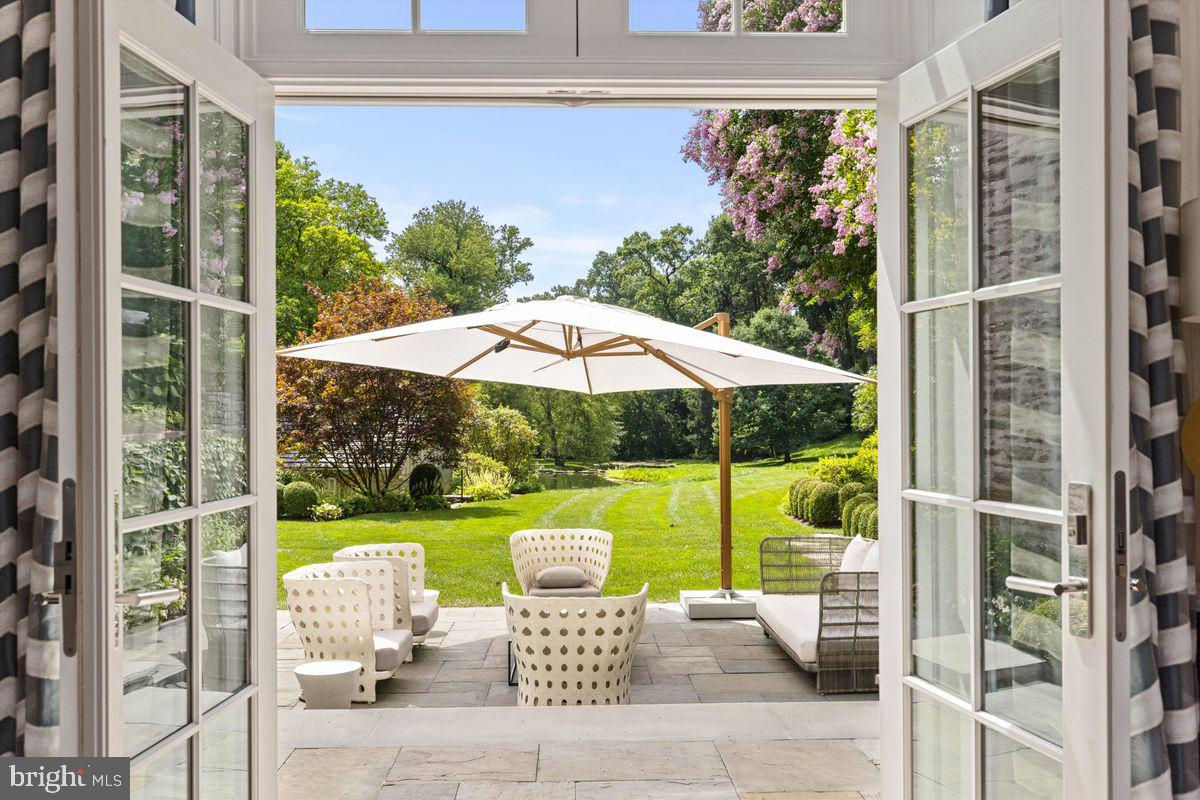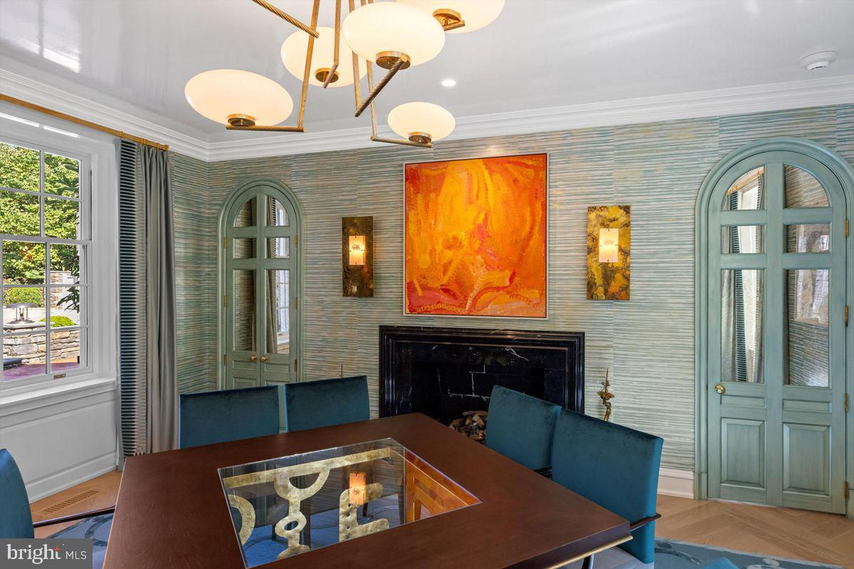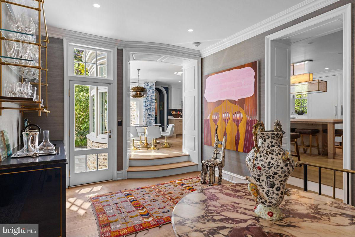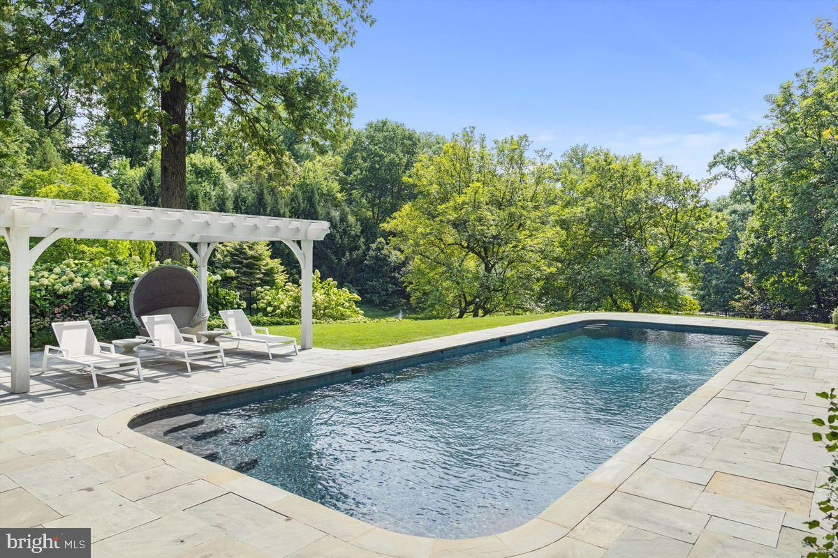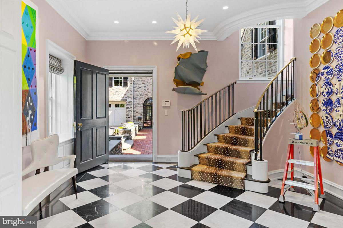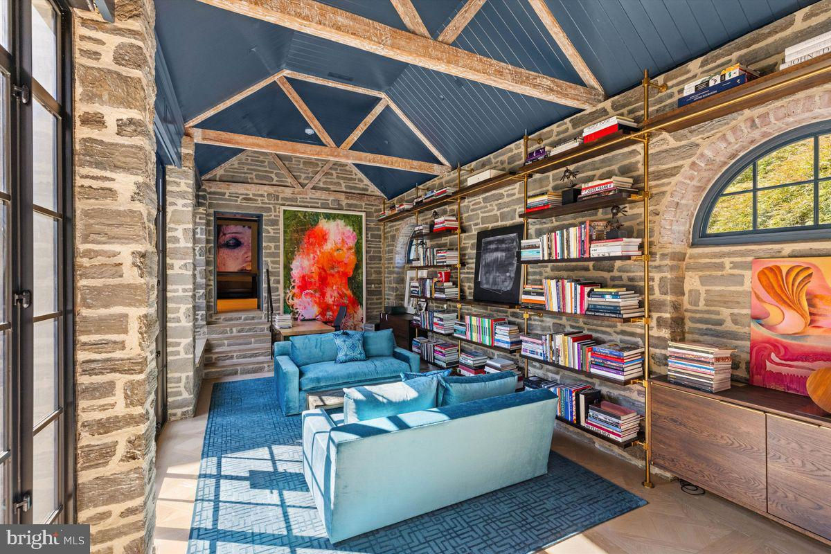 In the late 1700s, when Chestnut Hill was still many country miles outside of Philadelphia, a single-room-deep stone farmhouse was built in a valley where coldwater streams laced the forest floor. More than 200 years later, that simple stone house was seamlessly expanded by architect Peter Zimmerman into the best possible version of a classic Chestnut Hill stone home. Working with the terrain, Zimmerman created additions that blend organically into this most picturesque of settings. Beyond the immaculate parking courtyard and discreet navy blue main entry door lies a sophisticated, state-of-the-art residence. Beautifully designed for entertaining and daily living, the interior is a masterclass in color and pattern, infused with natural light and fresh energy unlike any other home in this sedate corner of Philadelphia. Interiors flow into outdoor garden “rooms,” each with a completely different feeling. Great care and much thought went into every space, from its reception area to the kitchen to its gathering spaces and private quarters upstairs. The house was completely gutted to incorporate all modern technological conveniences and amenities, including adaptive and remote lighting, temperature and security controls. Interior spaces were modernized and reorganized to accommodate lifestyle and entertaining requirements. This level of planning has resulted in a home that is aesthetically stunning and also easier to maintain and manage. The new site plan, which includes a pool, allows for sweeping views of the upper portion of the property as well as long vistas from nearly all of the interiors. As it flowed hundreds of years ago, the babbling brook is still there, well managed thanks to smart site engineering, flowing into and then out of a renovated springhouse into a large pond at the end of the property. A grass-covered stone walking bridge opens each side of the pond for long strolls around the property, creating the finishing touch to this private world that feels light years away from the city.