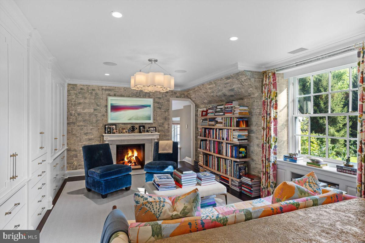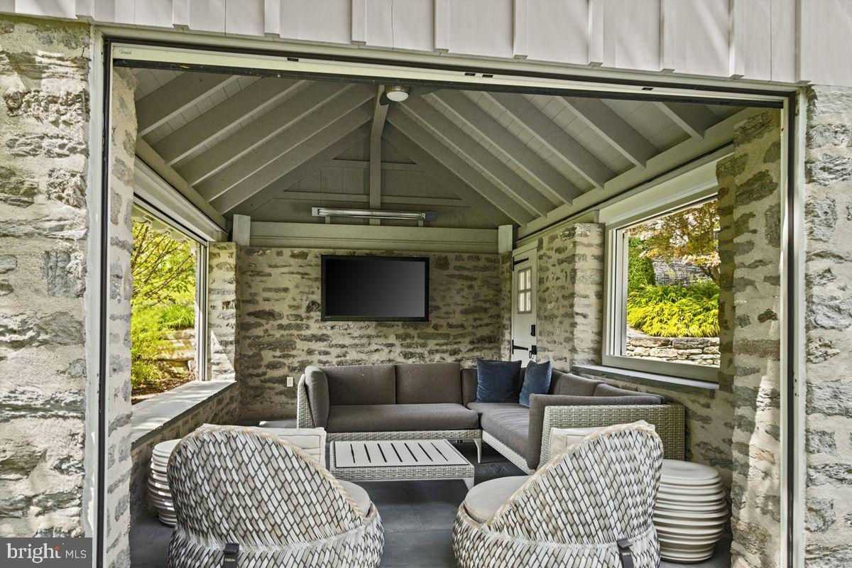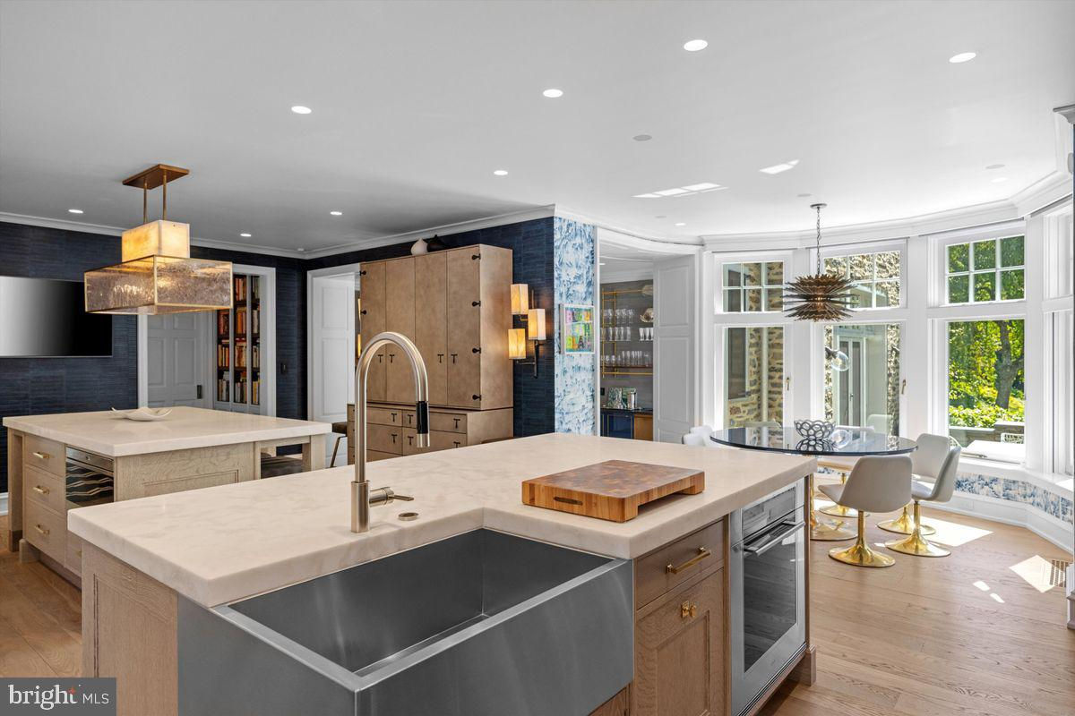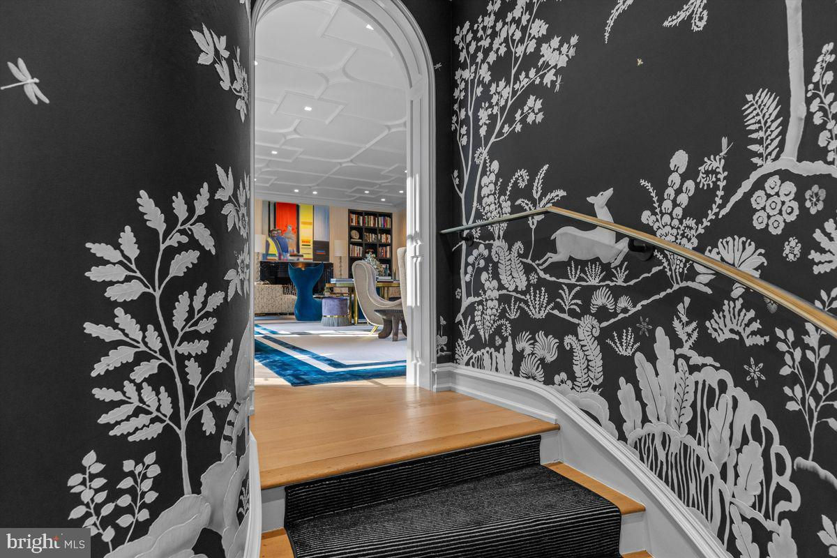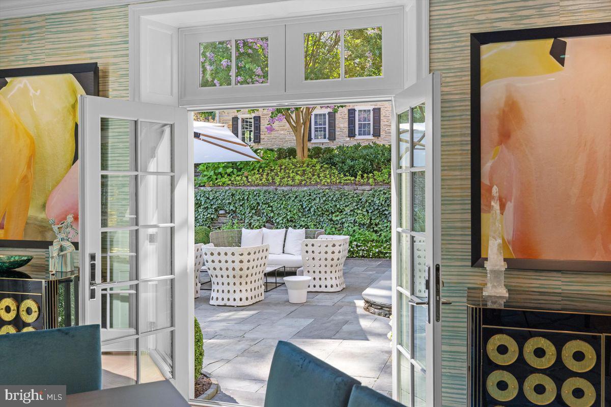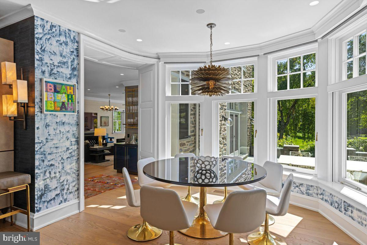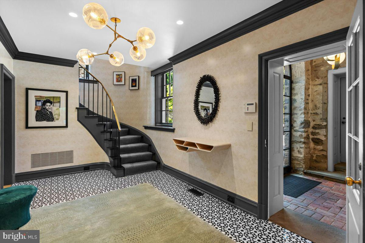 In the late 1700s, when Chestnut Hill was still many country miles outside of Philadelphia, a single-room-deep stone farmhouse was built in a valley where coldwater streams laced the forest floor. More than 200 years later, that simple stone house was seamlessly expanded by architect Peter Zimmerman into the best possible version of a classic Chestnut Hill stone home. Working with the terrain, Zimmerman created additions that blend organically into this most picturesque of settings. Beyond the immaculate parking courtyard and discreet navy blue main entry door lies a sophisticated, state-of-the-art residence. Beautifully designed for entertaining and daily living, the interior is a masterclass in color and pattern, infused with natural light and fresh energy unlike any other home in this sedate corner of Philadelphia. Interiors flow into outdoor garden “rooms,” each with a completely different feeling. Great care and much thought went into every space, from its reception area to the kitchen to its gathering spaces and private quarters upstairs. The house was completely gutted to incorporate all modern technological conveniences and amenities, including adaptive and remote lighting, temperature and security controls. Interior spaces were modernized and reorganized to accommodate lifestyle and entertaining requirements. This level of planning has resulted in a home that is aesthetically stunning and also easier to maintain and manage. The new site plan, which includes a pool, allows for sweeping views of the upper portion of the property as well as long vistas from nearly all of the interiors. As it flowed hundreds of years ago, the babbling brook is still there, well managed thanks to smart site engineering, flowing into and then out of a renovated springhouse into a large pond at the end of the property. A grass-covered stone walking bridge opens each side of the pond for long strolls around the property, creating the finishing touch to this private world that feels light years away from the city.