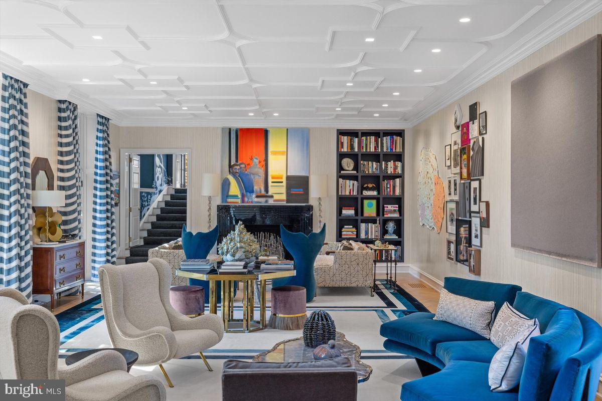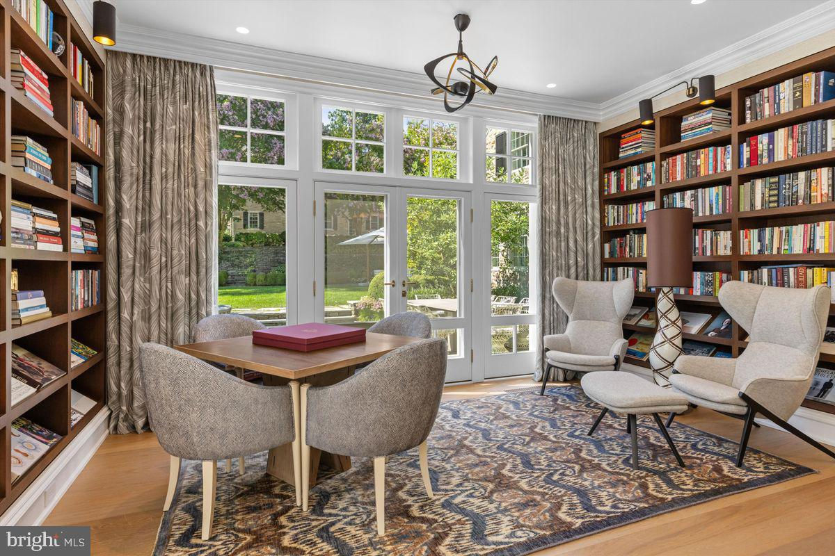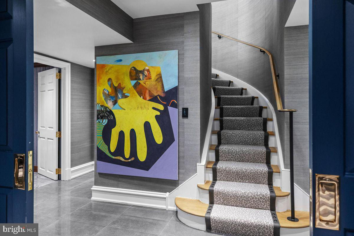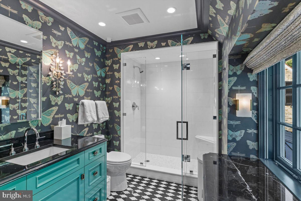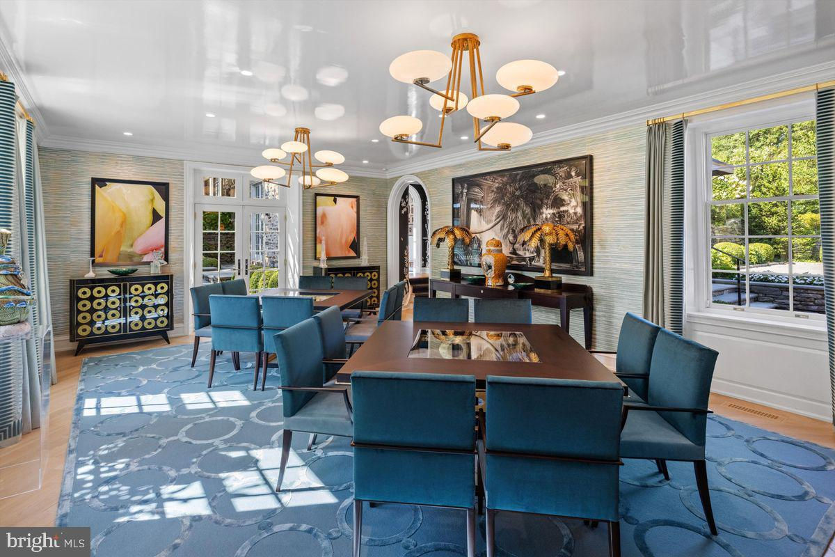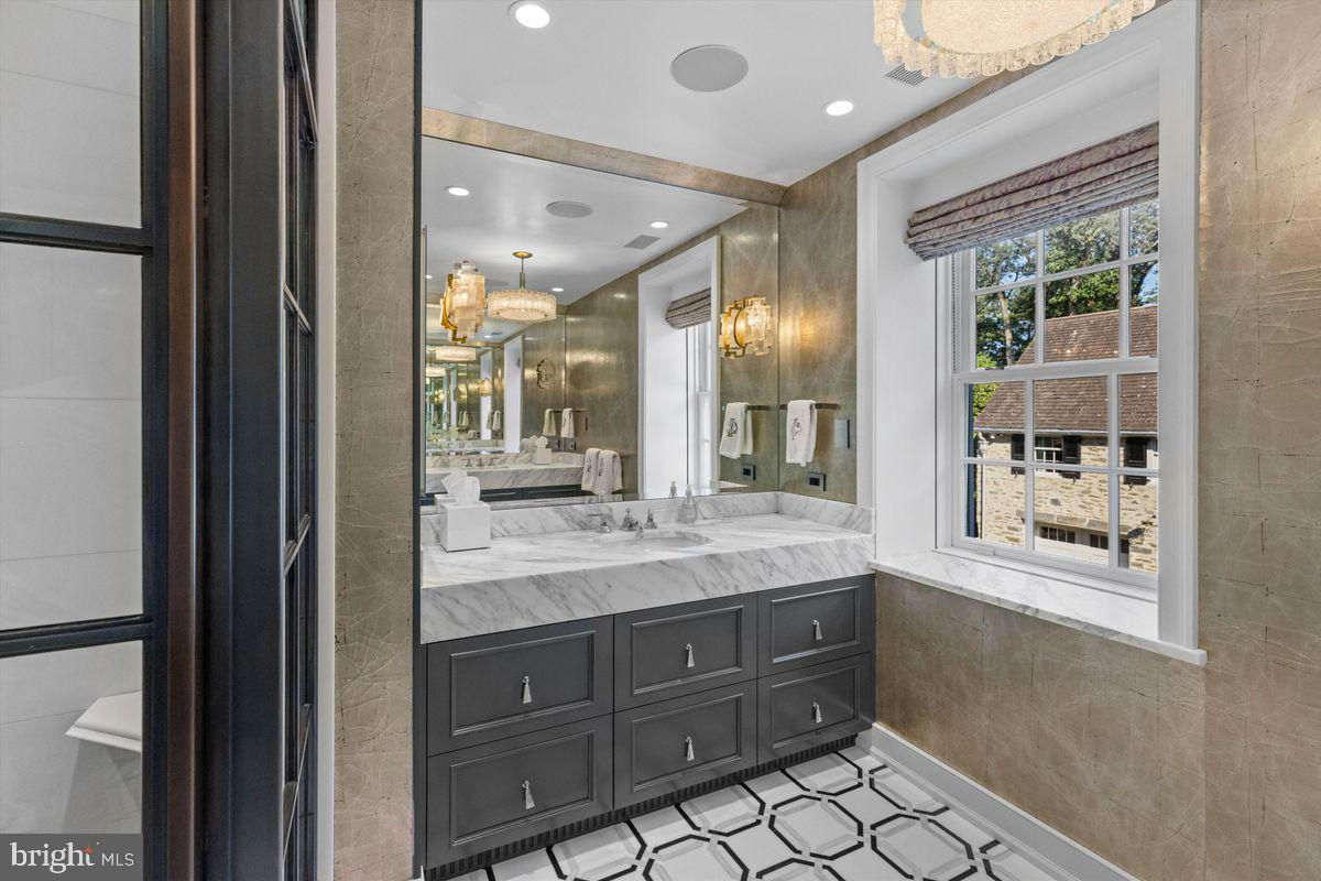 In the late 1700s, when Chestnut Hill was still many country miles outside of Philadelphia, a single-room-deep stone farmhouse was built in a valley where coldwater streams laced the forest floor. More than 200 years later, that simple stone house was seamlessly expanded by architect Peter Zimmerman into the best possible version of a classic Chestnut Hill stone home. Working with the terrain, Zimmerman created additions that blend organically into this most picturesque of settings. Beyond the immaculate parking courtyard and discreet navy blue main entry door lies a sophisticated, state-of-the-art residence. Beautifully designed for entertaining and daily living, the interior is a masterclass in color and pattern, infused with natural light and fresh energy unlike any other home in this sedate corner of Philadelphia. Interiors flow into outdoor garden “rooms,” each with a completely different feeling. Great care and much thought went into every space, from its reception area to the kitchen to its gathering spaces and private quarters upstairs. The house was completely gutted to incorporate all modern technological conveniences and amenities, including adaptive and remote lighting, temperature and security controls. Interior spaces were modernized and reorganized to accommodate lifestyle and entertaining requirements. This level of planning has resulted in a home that is aesthetically stunning and also easier to maintain and manage. The new site plan, which includes a pool, allows for sweeping views of the upper portion of the property as well as long vistas from nearly all of the interiors. As it flowed hundreds of years ago, the babbling brook is still there, well managed thanks to smart site engineering, flowing into and then out of a renovated springhouse into a large pond at the end of the property. A grass-covered stone walking bridge opens each side of the pond for long strolls around the property, creating the finishing touch to this private world that feels light years away from the city.