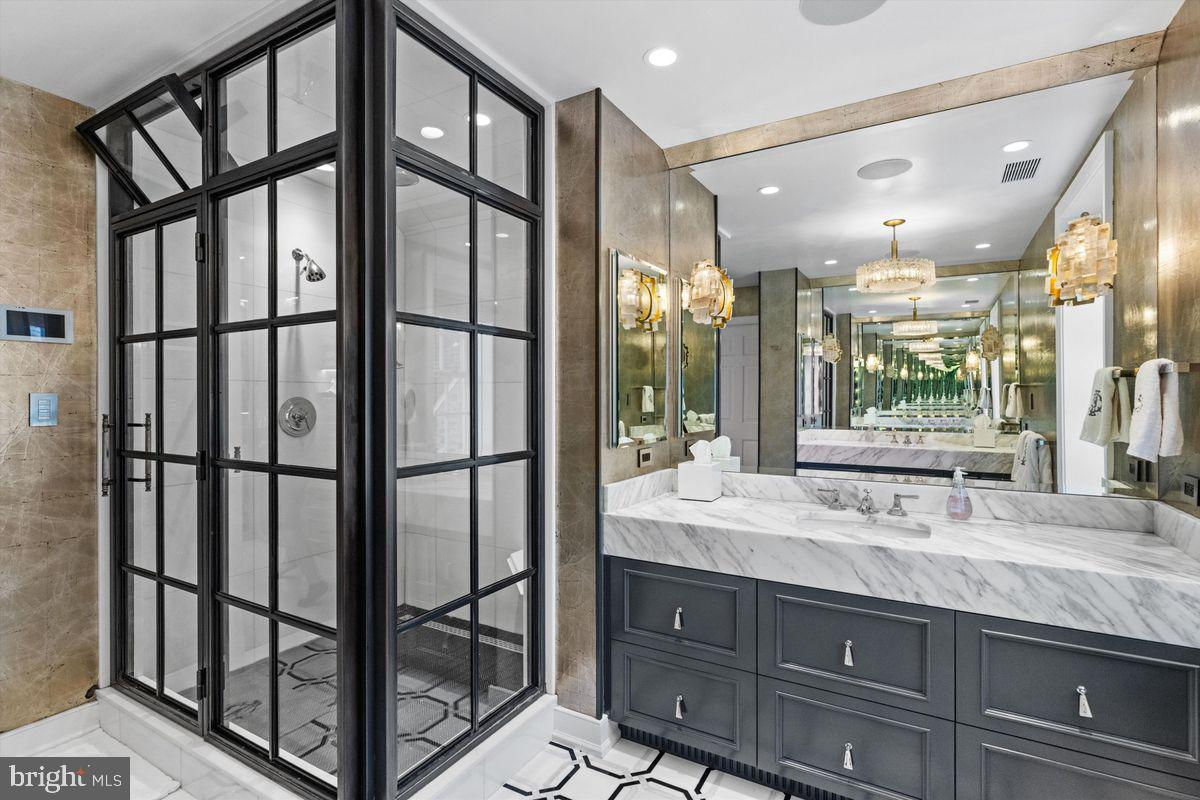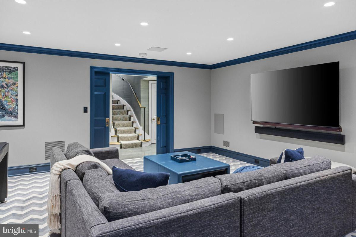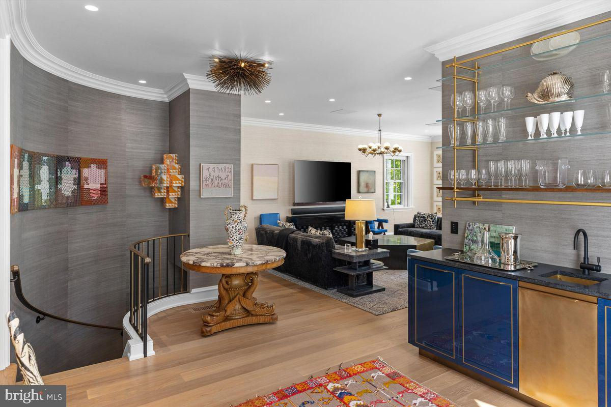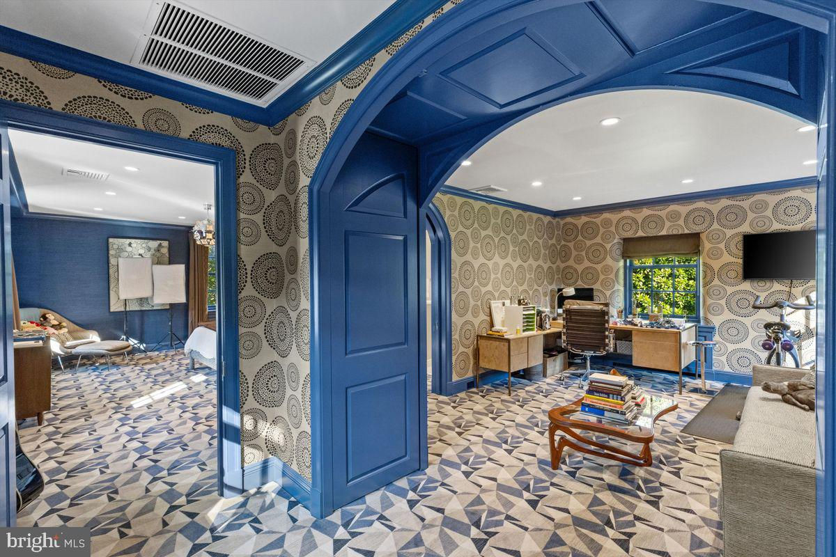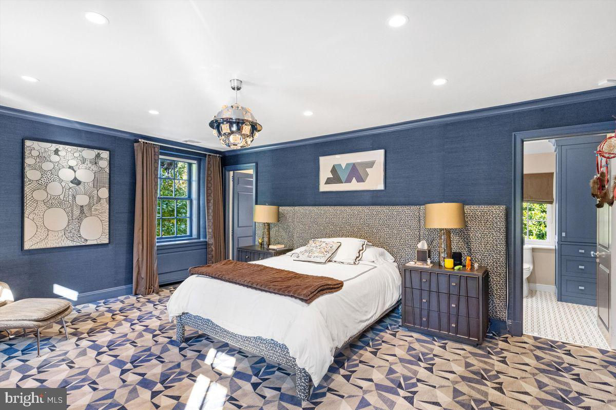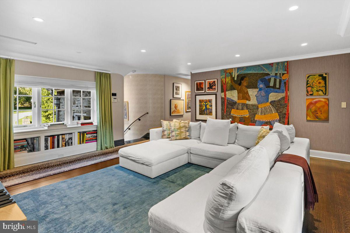 In the late 1700s, when Chestnut Hill was still many country miles outside of Philadelphia, a single-room-deep stone farmhouse was built in a valley where coldwater streams laced the forest floor. More than 200 years later, that simple stone house was seamlessly expanded by architect Peter Zimmerman into the best possible version of a classic Chestnut Hill stone home. Working with the terrain, Zimmerman created additions that blend organically into this most picturesque of settings. Beyond the immaculate parking courtyard and discreet navy blue main entry door lies a sophisticated, state-of-the-art residence. Beautifully designed for entertaining and daily living, the interior is a masterclass in color and pattern, infused with natural light and fresh energy unlike any other home in this sedate corner of Philadelphia. Interiors flow into outdoor garden “rooms,” each with a completely different feeling. Great care and much thought went into every space, from its reception area to the kitchen to its gathering spaces and private quarters upstairs. The house was completely gutted to incorporate all modern technological conveniences and amenities, including adaptive and remote lighting, temperature and security controls. Interior spaces were modernized and reorganized to accommodate lifestyle and entertaining requirements. This level of planning has resulted in a home that is aesthetically stunning and also easier to maintain and manage. The new site plan, which includes a pool, allows for sweeping views of the upper portion of the property as well as long vistas from nearly all of the interiors. As it flowed hundreds of years ago, the babbling brook is still there, well managed thanks to smart site engineering, flowing into and then out of a renovated springhouse into a large pond at the end of the property. A grass-covered stone walking bridge opens each side of the pond for long strolls around the property, creating the finishing touch to this private world that feels light years away from the city.