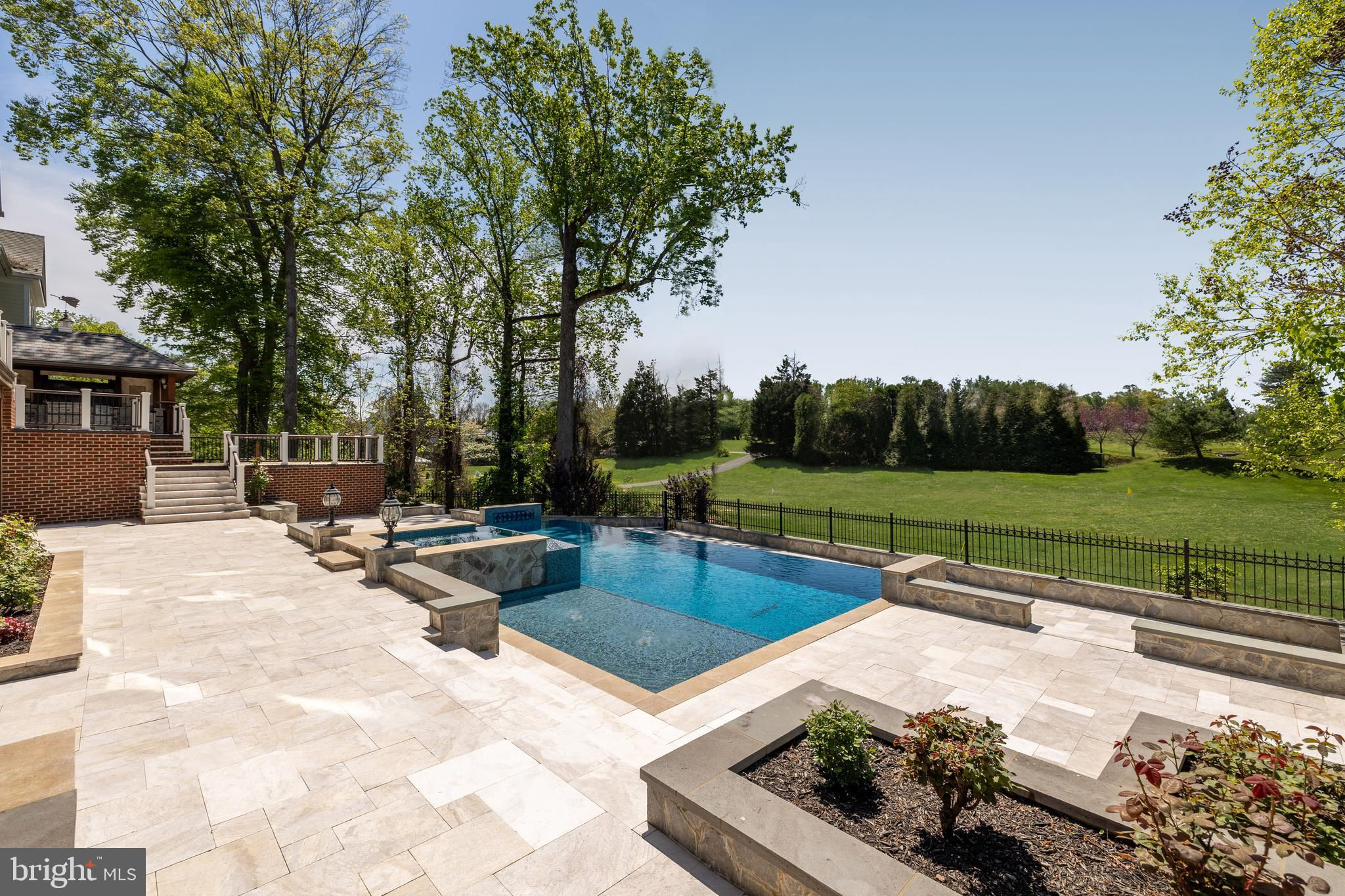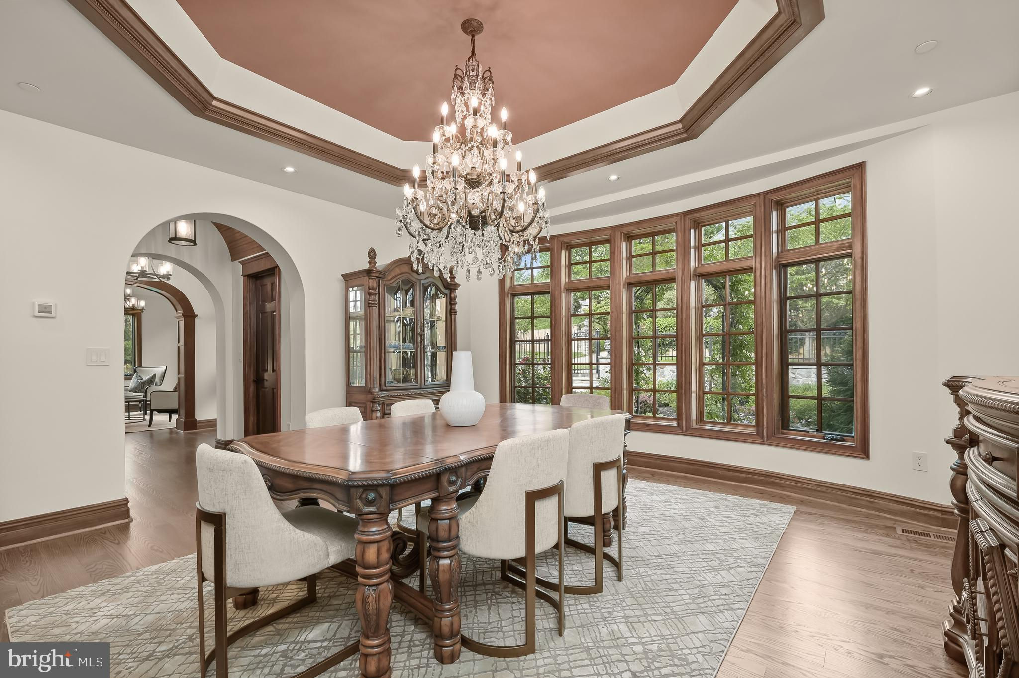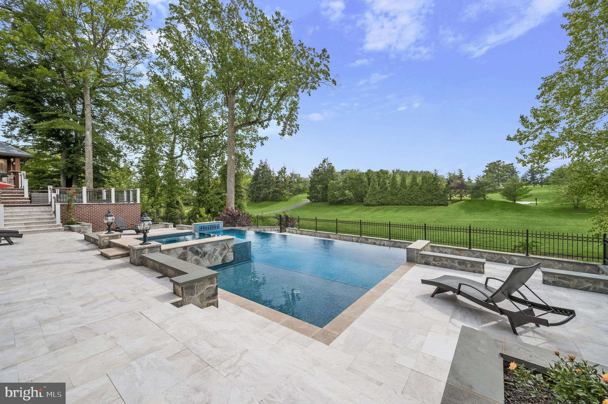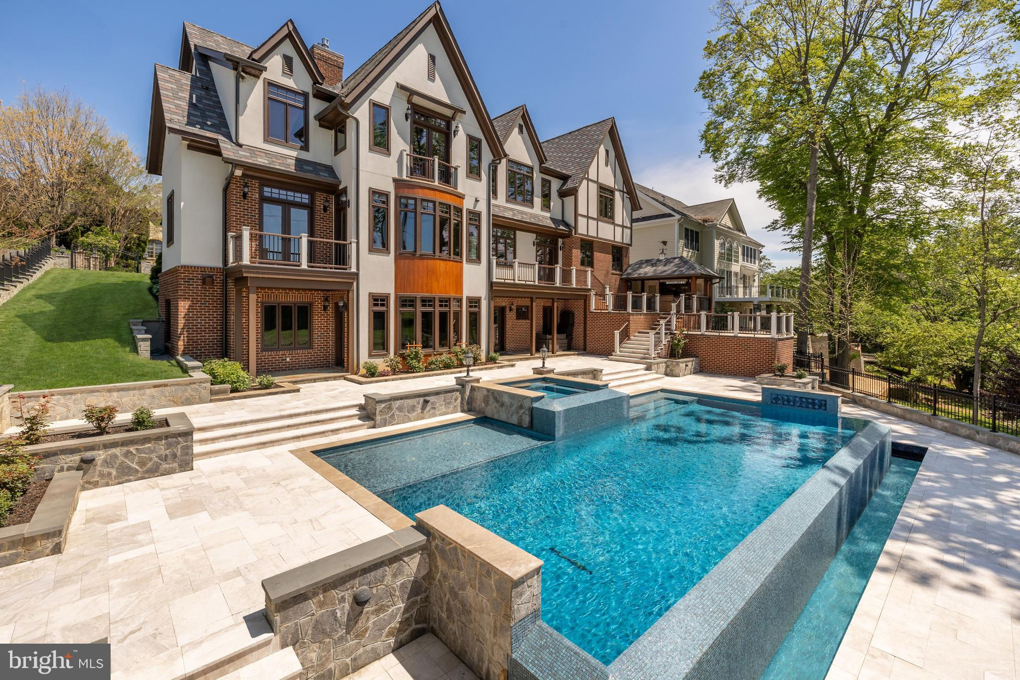 6416 Garnett Drive, is a spectacular, newly constructed Tudor estate backing to whimsical rolling golf course vistas and enchanting sunsets. Fully custom designed from the ground up, the home features 8,500 square feet of exquisite living space comprising the finest in materials and workmanship spread across a floor plan equally apt at accommodating large scale entertaining as well as casual contemporary lifestyles. A fully gated entrance embellished with decorative, lighted stone pillars reveals beautifully planted gardens with a profusion of colorful flowering specimens. The paver driveway connects to an attached two car garage and adjoins a flagstone walkway leading to the main entrance. An artfully arched solid wooden entry door reveals an elegant reception vestibule, around which formal living and dining rooms are arranged in a classic center hall configuration. The former revolves around a roaring gas fireplace, while the latter’s resplendent curved wall of windows brings in copious amounts of natural light reflecting off the twinkling crystal chandelier. Throughout the home, exquisite millwork complements the wide plank oak floor, covering moldings, baseboards, window trim, and intricate ceilings. As is exemplary in the chef’s kitchen with custom cabinetry, whose coffered ceiling is a focal point. Stacked cabinetry, a contrasting center island with integrated bar seating, commercial grade SubZero and Wolf appliances, and double glass doors leading directly onto the rear terrace establish this space as the heart of the home. The adjacent breakfast area features an integrated bench with sweeping views beyond, shared by the large family room with coffered ceiling and a wall of windows. A two-sided linear fireplace connects the space to an adjoining study, offering a tranquil retreat with private outdoor access. An upper level sitting area serves as a cozy gathering space. Branching off the space, through a set of double leather-bound doors, is the sumptuous primary suite. A raised beamed ceiling, chic linear fireplace, and private balcony overlooking the golf course complement the ubiquitous spa-inspired bath and commodious dressing rooms to establish a home within a home. Six additional secondary bedrooms are all generously proportioned and feature ensuite baths. The ethereal lower level sits above ground, allowing the entry of natural light. An entertainer’s delight, the space is amenity-rich with a full wet bar, fitness center, and professional media room. The home’s outdoor spaces are its true showstopping feature. The rear terrace spans multiple levels and houses a fully equipped, covered outdoor kitchen with top of the line appliances to accommodate al fresco entertaining on the grandest of scales. It descends down to a splendid limestone patio with multiple locations for loungers. The infinity pool is the pièce de résistance, offering glorious, unparalleled views reflected in its shimmer and a bubbling adjoining hot tub. With unrivaled views and situated on one of Kenwood’s most premium lots, 6416 Garnett Drive offers a one-of-a-kind blend of luxury and modern livability in one of the Capital Region’s most sought-after locations.