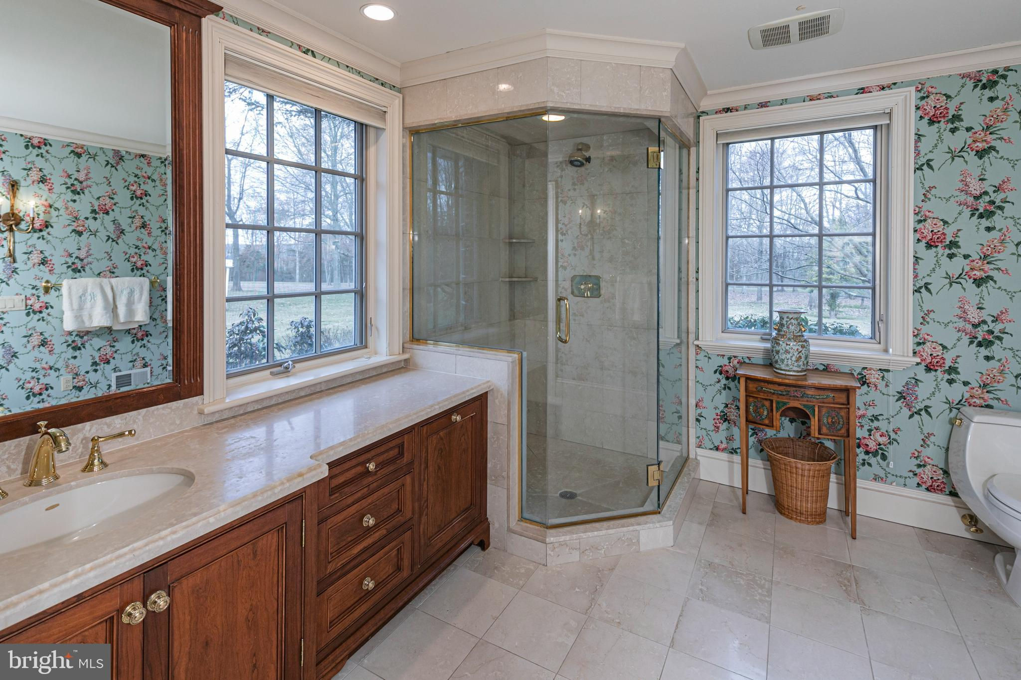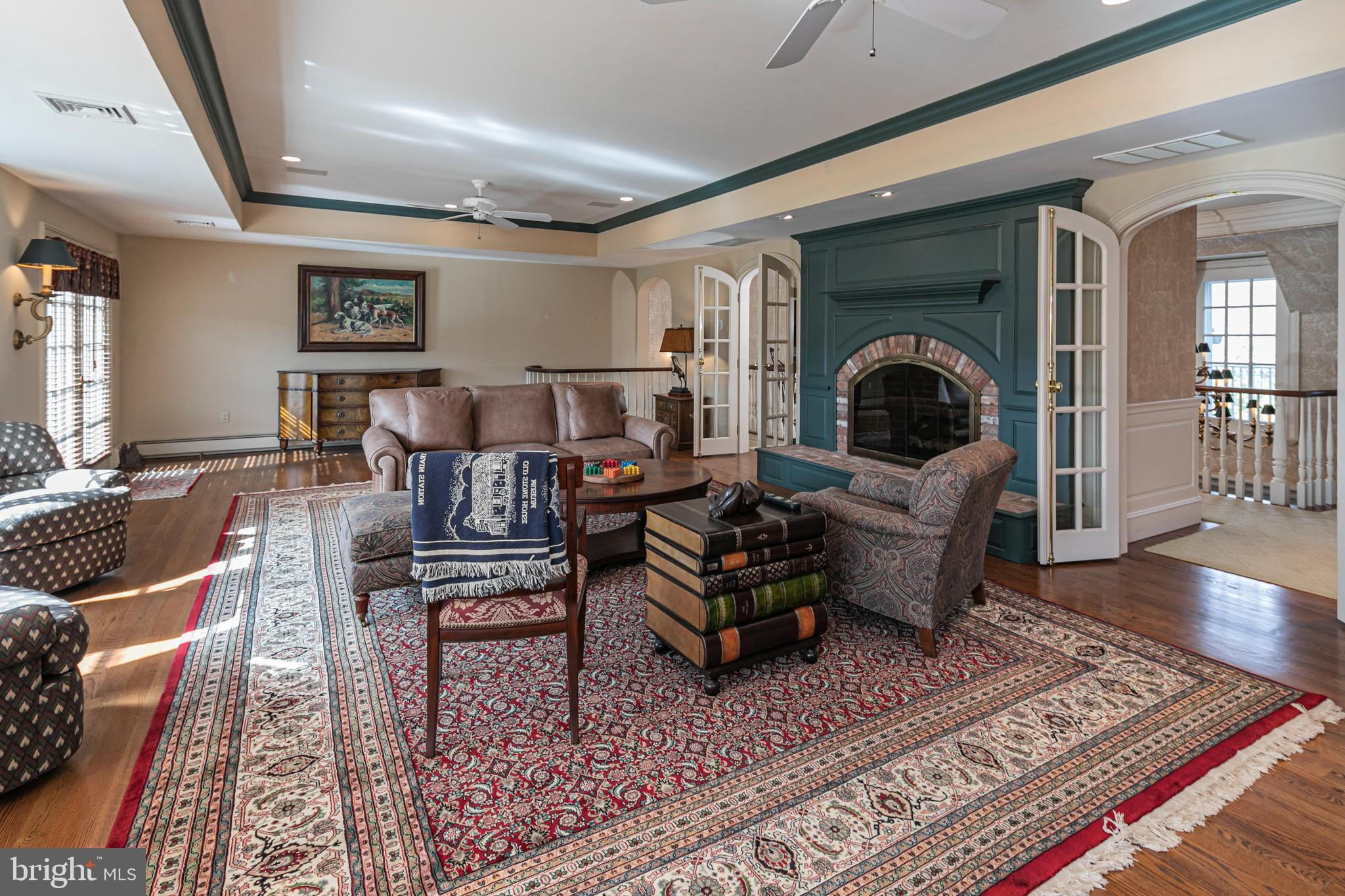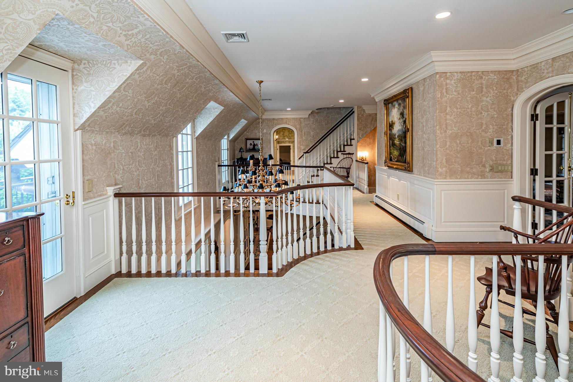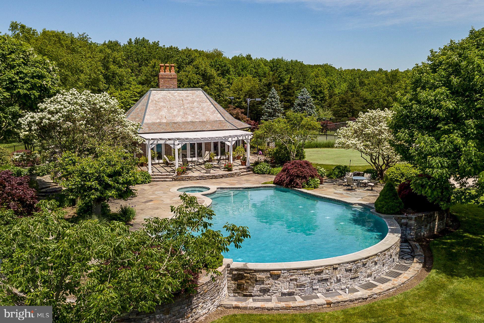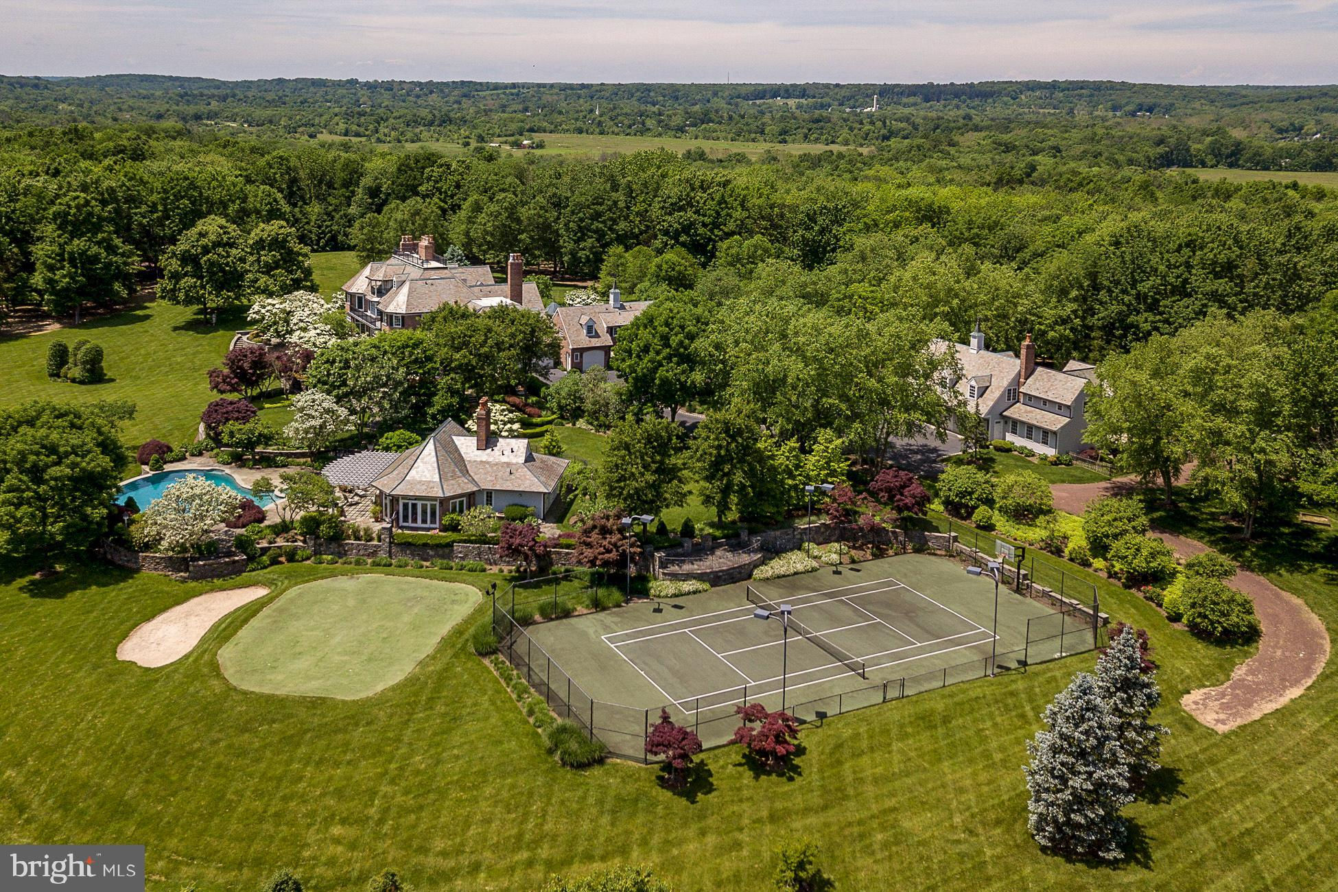 Past the gates, winding up the driveway, you get a sense of the seemingly endless land encircling this brick manor home and finally you realize why this is called the Garden State. The nearly 26 acres are home to heirloom trees and sculpted gardens contained by a stone wall, as well as a pond offering Heaven-on-Earth views from southerly windows. It s hard to fathom that the scene is a mere 55 miles from NYC and even less from Philadelphia. Or catch the train, just 10 miles away. The sprawling home and outbuildings, all capped with slate, have custom spaces devoted to every leisurely pursuit from wellness to wine collecting. Rooms are invitingly scaled, eleven of them with masonry fireplaces. A mahogany library with upper gallery is among the more intimate spaces, while the lower level s cherry bar and theater are meant to be enjoyed with guests, as is the airy pool house complete with a fireplace, kitchen, full bath and views of an infinity-edge pool. Three of the large bedrooms open to balconies and all have en suite bathrooms. An apartment and 3-bedroom carriage house offer additional lodging. There are tennis and basketball courts and 7 garages. Imagine being able to offer this ultimate weekend escape to loved ones near and far. If farmland assessment is not continued, the buyer will be responsible for roll back taxes.