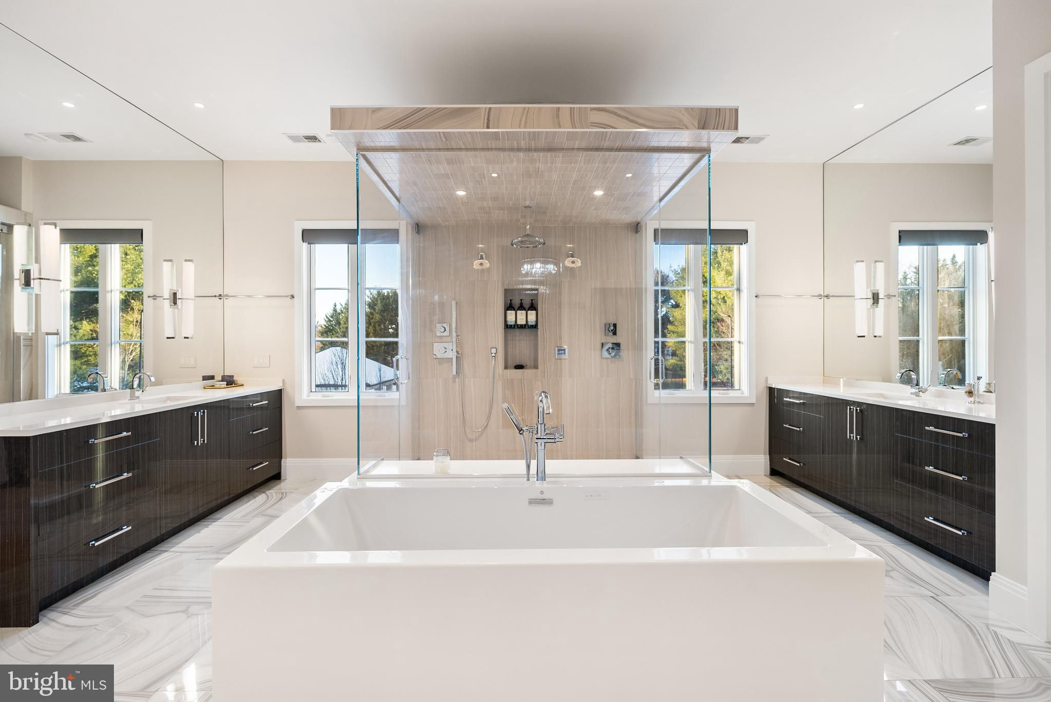 Sited on a tree-lined street in the Avenel Community of Bethesda, this exceptional renovated estate epitomizes modern luxury and refined elegance. Boasting 6 bedrooms, 9.5 bathrooms, and approximately 14,900 SF of exquisitely designed living space across 4 levels, serviced by an elevator for effortless convenience. The Main Level welcomes you through a grand vestibule and foyer, flanked by a formal Dining Room and Living Room. A two-sided gas fireplace divides the Living Room and an inviting Study, ideal for work or relaxation. A Gourmet Kitchen, complete with a Breakfast Room, that seamlessly flows into a spacious Family Room adorned with tray ceilings and a wet bar, and complete with a separate wine bar and pantry provides the perfect amenities for entertaining and everyday living. The Family Room opens to a covered terrace and rear patio featuring a swimming pool, hot tub, fire pit area, and tennis court, creating an unparalleled outdoor oasis. An attached 4-car garage with direct access to a Mudroom, a Playroom, 2 walk-in closets, a full Bathroom and a half Bathroom complete this level’s offerings. The Upper Level is anchored by a luxurious Primary Suite with two expansive walk-in closets, a spa-like bathroom, and access to a connecting balcony with a pergola. Four additional ensuite Bedrooms, each with walk-in closets and private bathrooms, provide comfort and privacy for family and guests alike. A Laundry Room and elevator add convenience to everyday living. The Lower Level offers an entertainer’s dream with a large Recreation Room featuring a wet bar, an Exercise Room, a 6th Bedroom Suite, an additional Bathroom, a Storage Room, Utility Space, and access to the elevator. Stairs from the Lower-Level lead to a dedicated indoor full-sized sports court, complemented by additional storage rooms, making it ideal for year-round activities and recreational pursuits. From its exquisite indoor spaces to its resort-like outdoor amenities, this Bethesda estate offers an unparalleled lifestyle in proximity to the area’s revered dining, retail, and entertainment. Zoned for Carderock Springs ES, Thomas W. Pyle MS, and Walt Whitman HS.